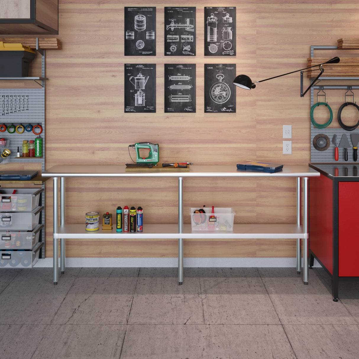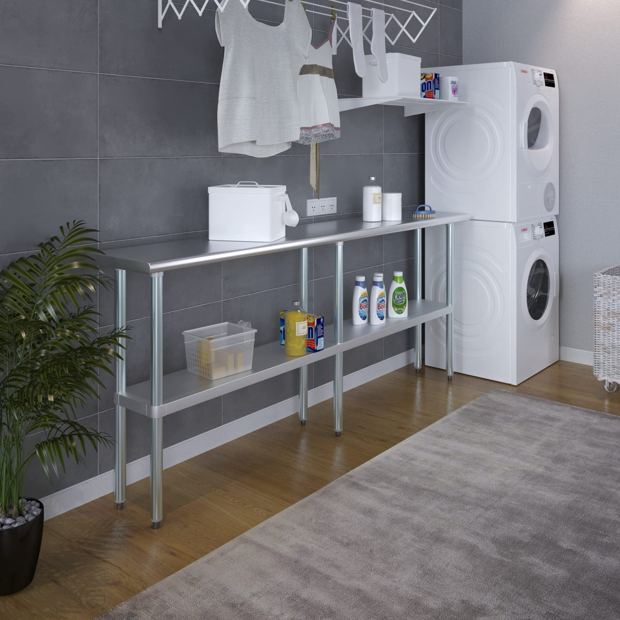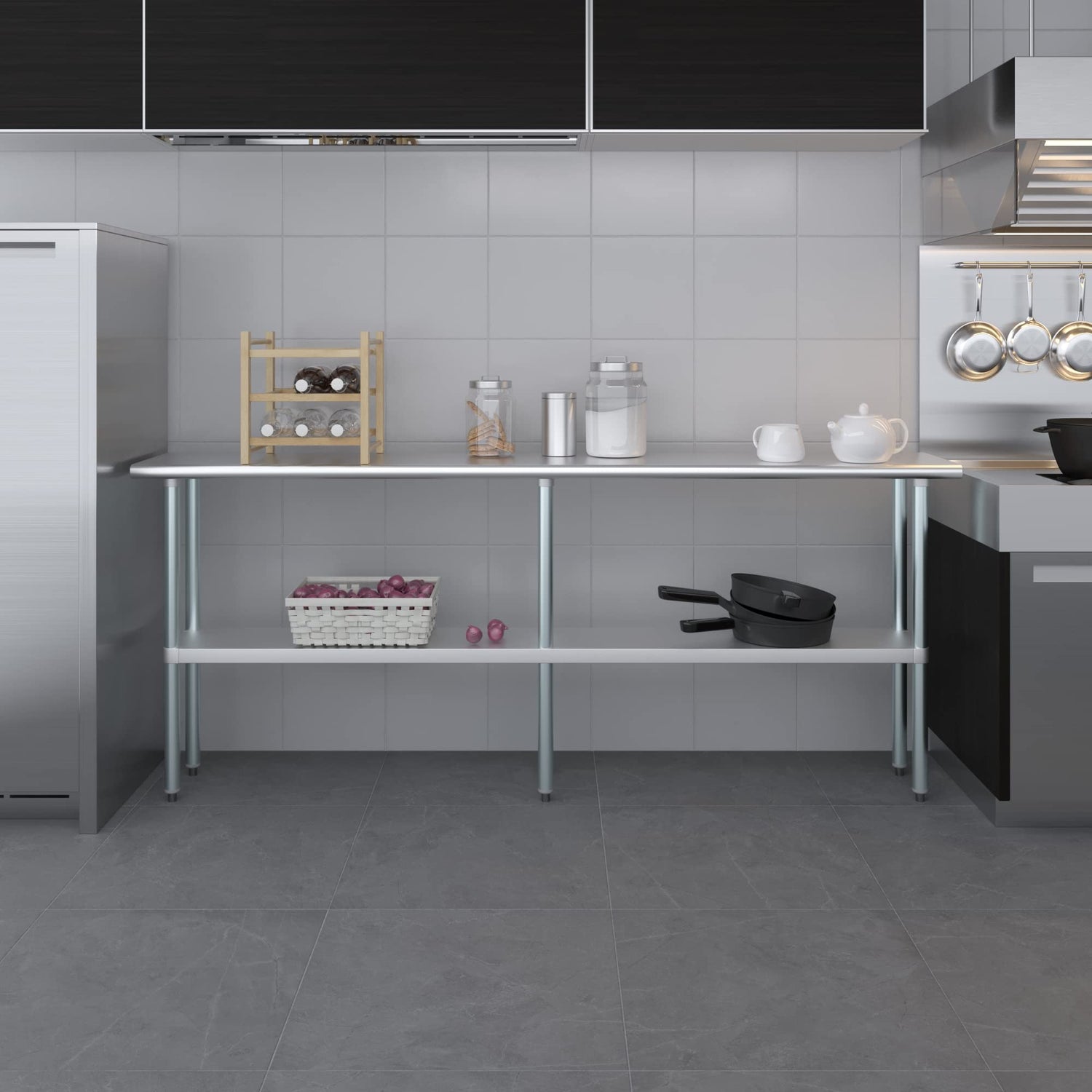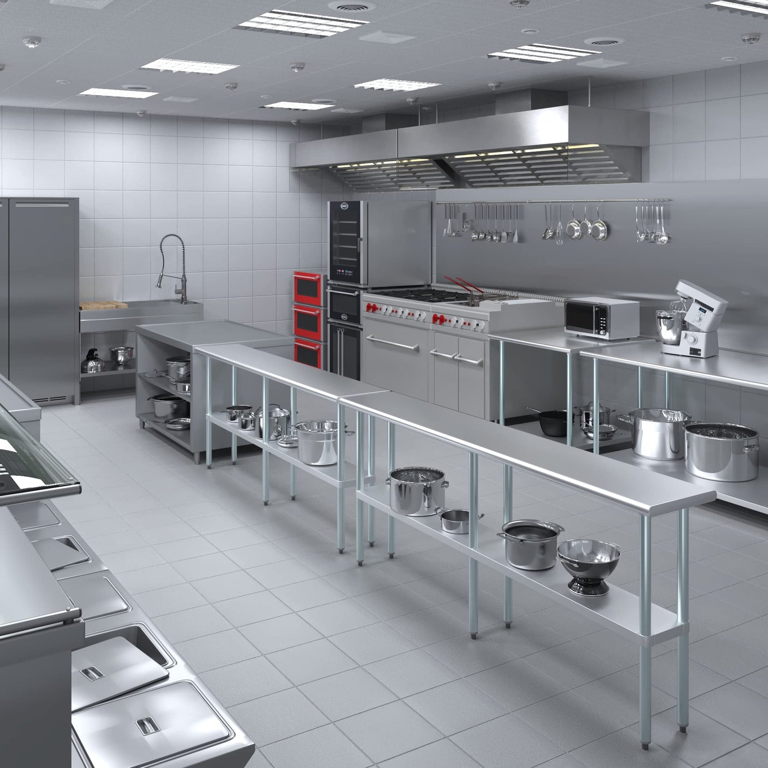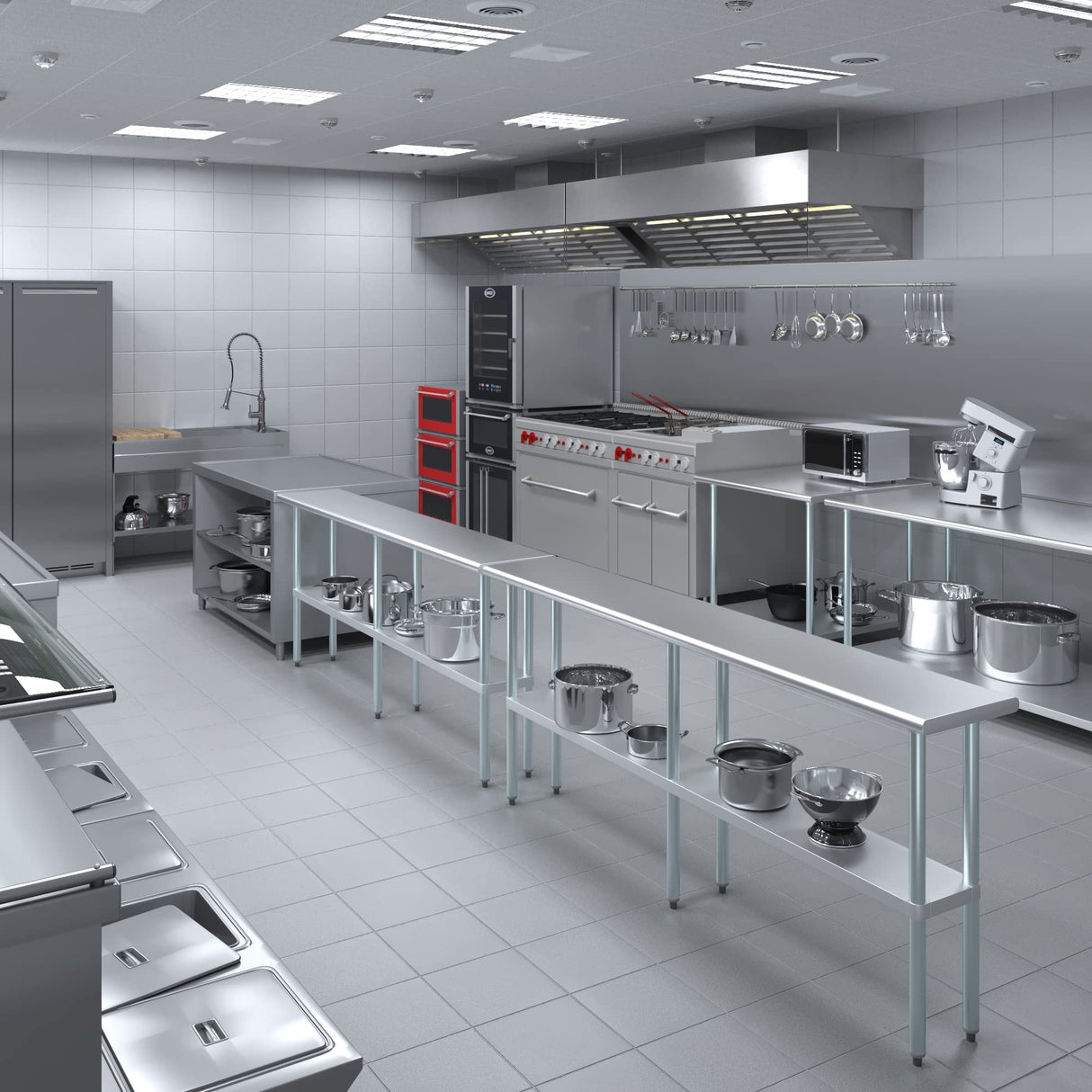 - "This heavy-duty industrial quality multi-purpose stainless steel utility table is a great fit for a variety of commercial and residential applications such as commercial kitchens, garages, labs, laundry room, etc The tabletop is made with 18 gauge 430 stainless steel The bottom shelf and the legs are made with galvanized steel. Adjustable bullet feet allow to improve stability on uneven floors and prevent the floor from being scratched.