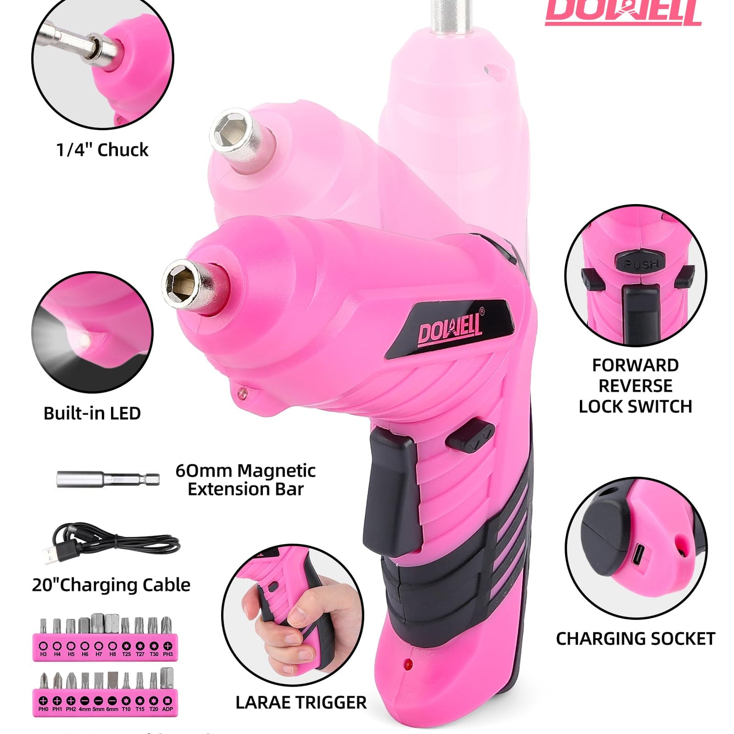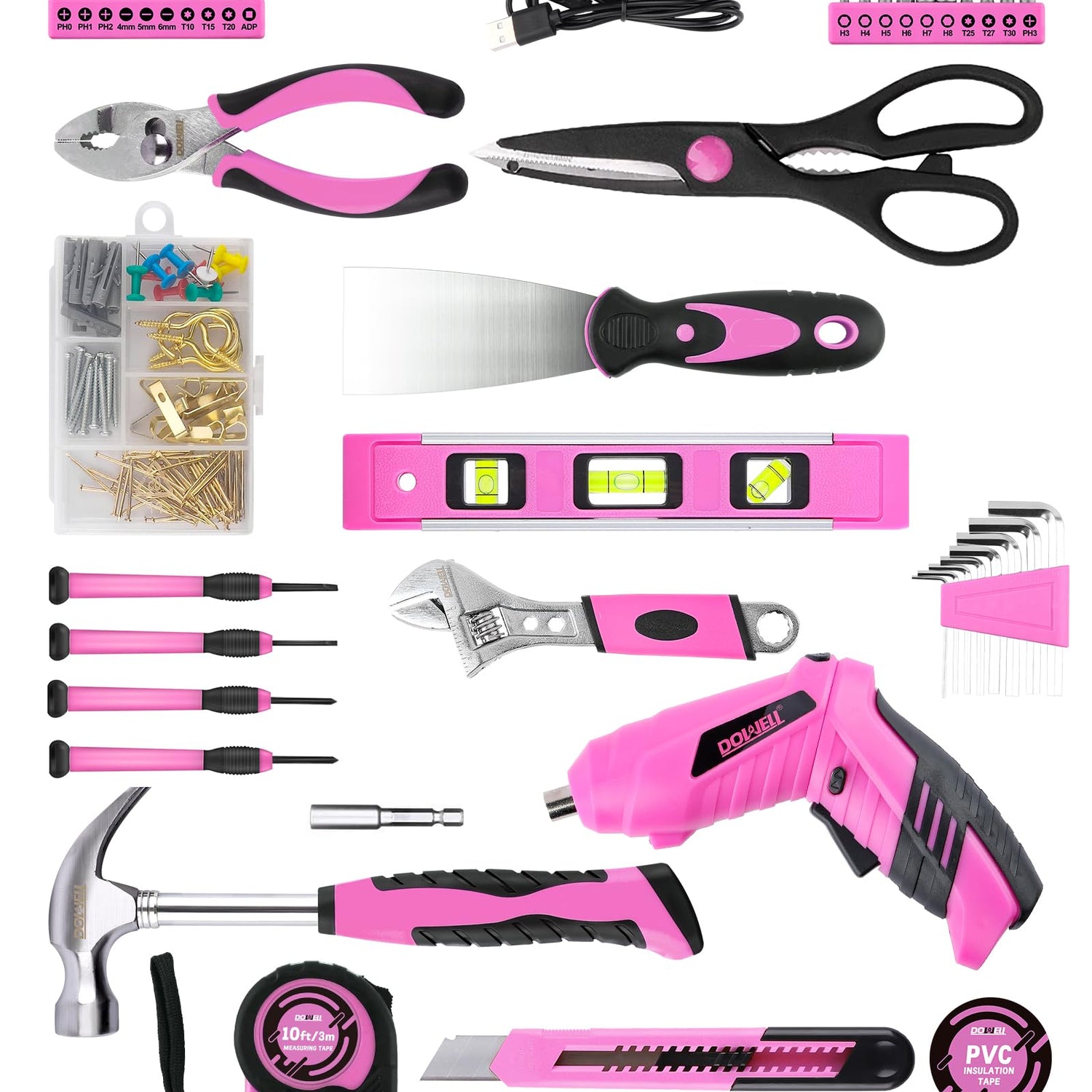 - 143-PCS PINK TOOL KIT: A cordless electric screwdriver with variety of basic tools, hammer, adjustable wrenches, pliers, scissors, utility knife, measuring tape, scrapper, mini level, precision screwdrivers, hex keys, bits set and so on. Limited tools with unlimited functionality.