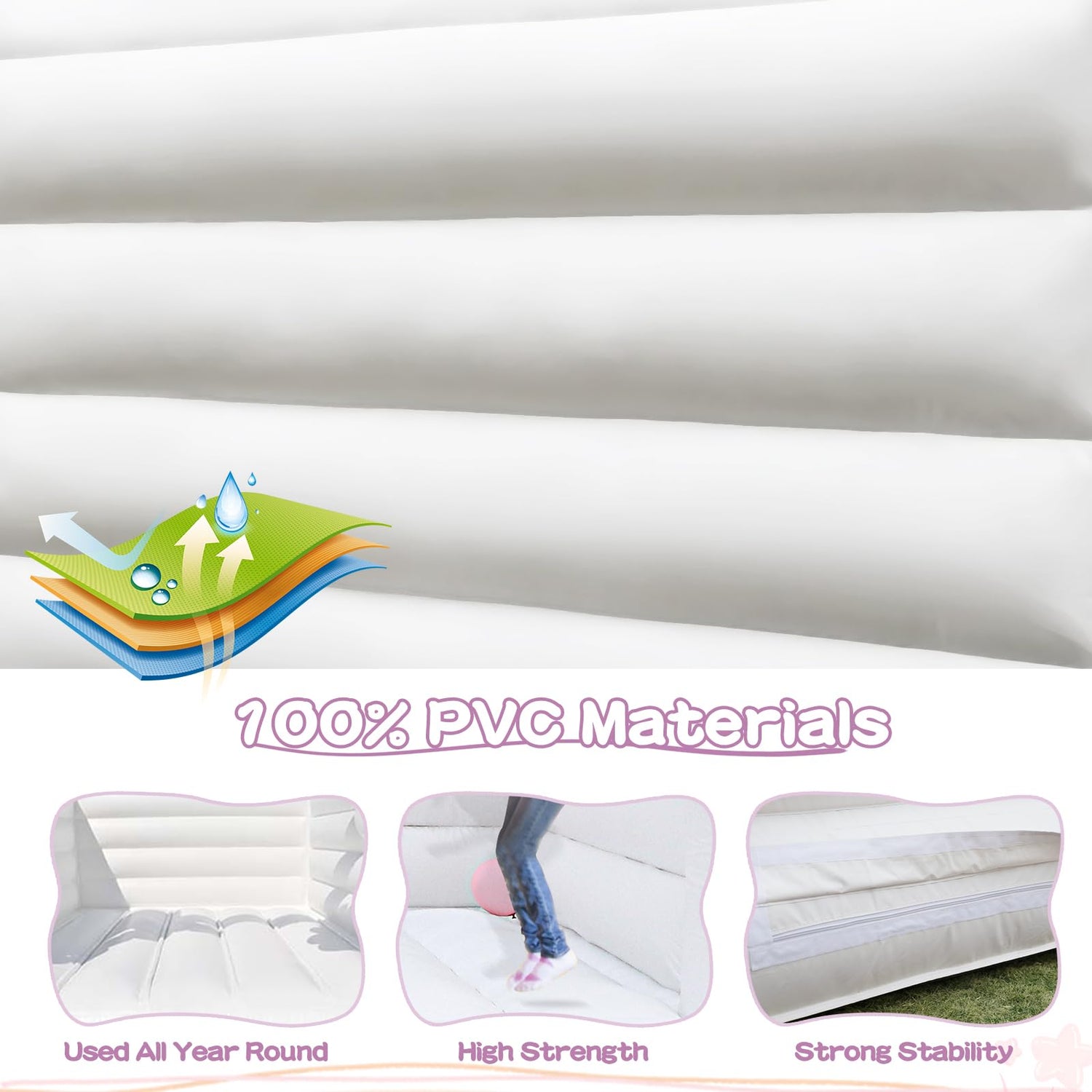 - High-Quality Materials: Crafted from 100% premium PVC , this inflatable castle is designed to withstand active play. The rigorous manufacturing process ensures durability and safety, providing a secure environment for children.