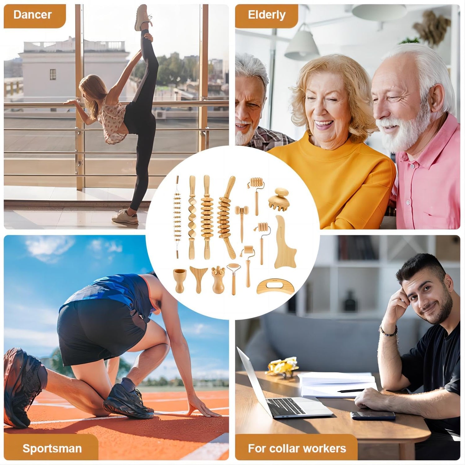 - 【15-in-1 Comprehensive Set】: Experience the benefits of 15 essential cellulite wood treatment tools in a massage tool set. Includes 8 facial massage sets, 1 wooden scraping board, 1 square five-bead roller massager, 1 9-wheel curved roller massager, 1 9-wheel vertical roller massager, 1 wooden back massage roller rope tool , 1 moon-shaped gua sha board and 1 wooden mushroom massager.
