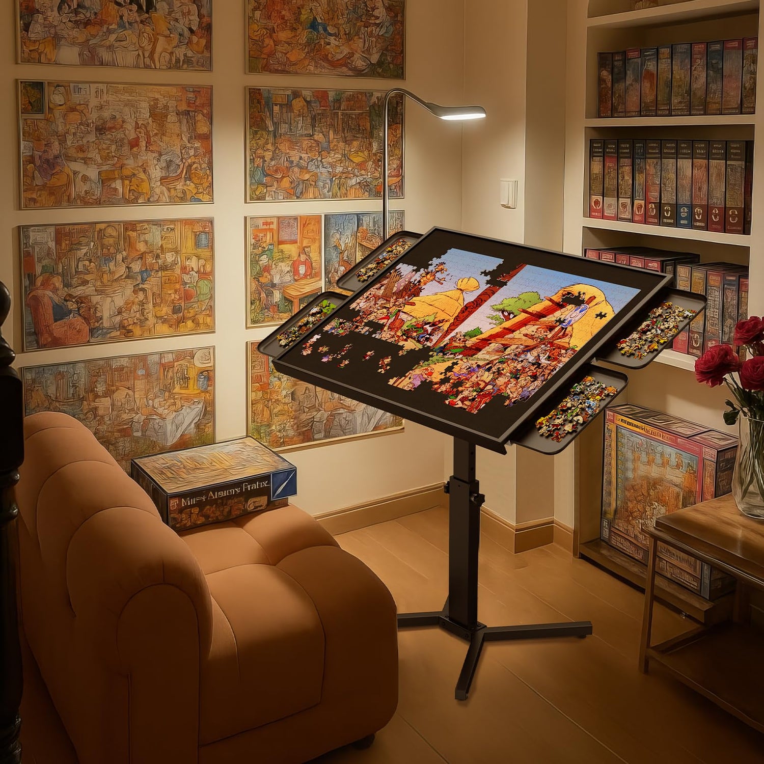- Easily adjustable tilt angle & height: Our jigsaw tables are designed with a single leg to provide plenty of legroom during use. Also has an adjustable tilt function, puzzle table allows you to set your puzzle at the perfect angle—up to 40 degrees, No more straining your neck or leaning awkwardly over a flat surface. Height adjustable from 28 ~ 35 in (55 to 87 cm), The adjustable legs ensure that your table stays at the perfect height for your comfort, Whether you prefer working seated or standing, this table can adapt to your needs, giving you a clear, comfortable view of every piece.