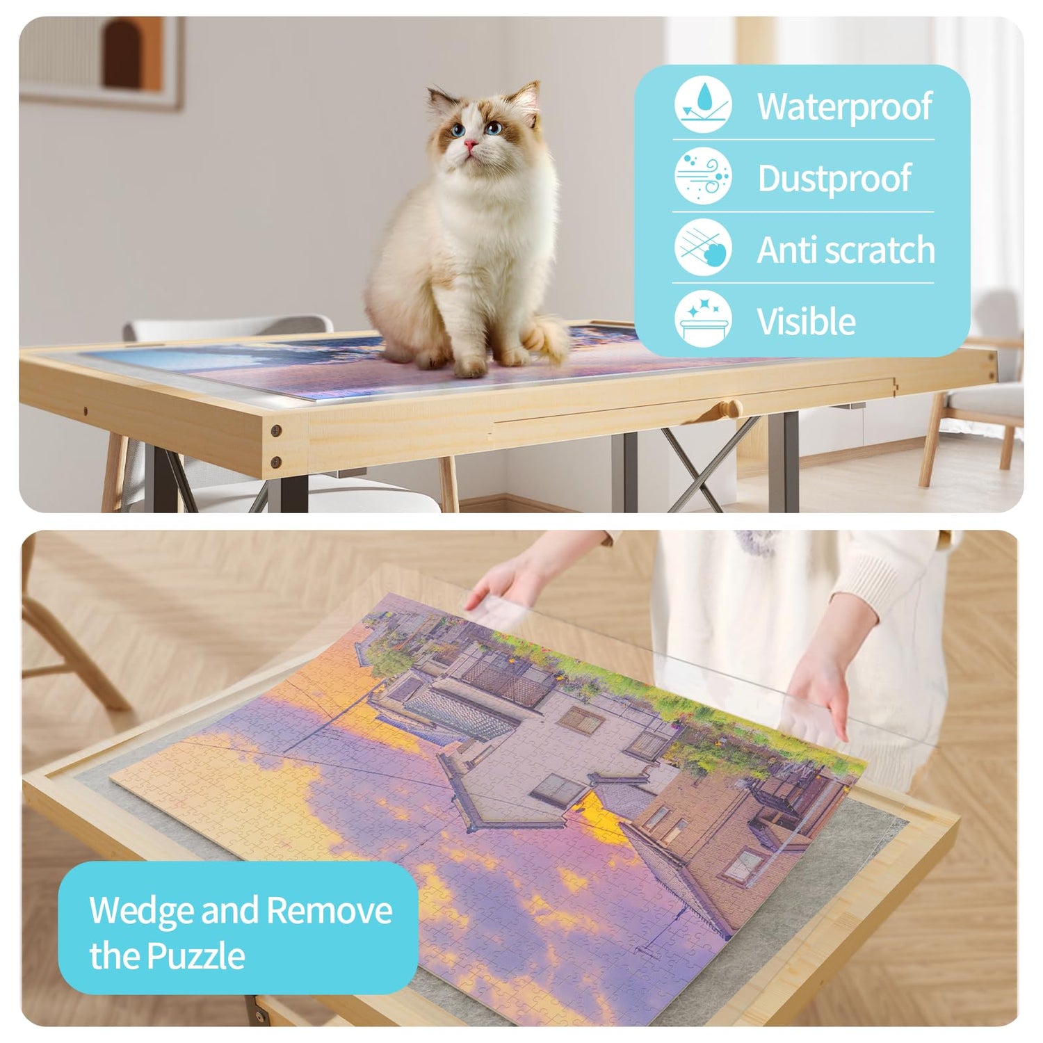 - 【Extended Support Bar and Transparent Protective Cover】 A 34-inch extended wooden support bar is installed at the back of the tabletop, preventing warping and ensuring a flat work surface at any tilt angle. The transparent PET protective cover shields unfinished puzzles from water, dust, and pets while allowing you to admire your masterpiece at any time