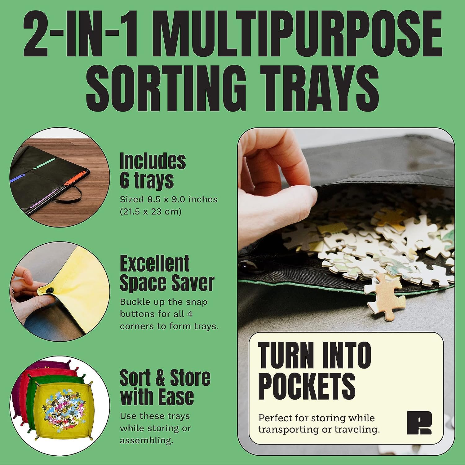 - Designed for Jigsaw Puzzle Lovers: Our Puzzle Board is all in one solution. High-Quality Zipper ensures a Sturdy Closure System, Superior Vegan Leather for stylish look and Long-Lasting, Waterproof Material for safety of your masterpiece, Non-Slip Microsuede workspace and strong Carrying Hndle to move around easily. Also (6) Colorful Puzzle Sorting Trays to sort and hold your jigsaw puzzle pieces.