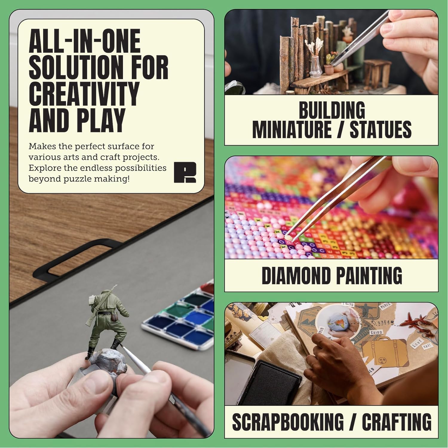- Level Up your Puzzle Game: Conveniently store, transport, and assemble your favorite puzzles with our Portable Jigsaw Puzzle Board! The flexible and strong carrying handle makes it easy to move around, while the portable design keeps it safe from pets and children. With its removable puzzle board working area, this puzzle caddy is perfect to use as puzzle storage and organizer - making it the perfect addition to any puzzle lover's collection.