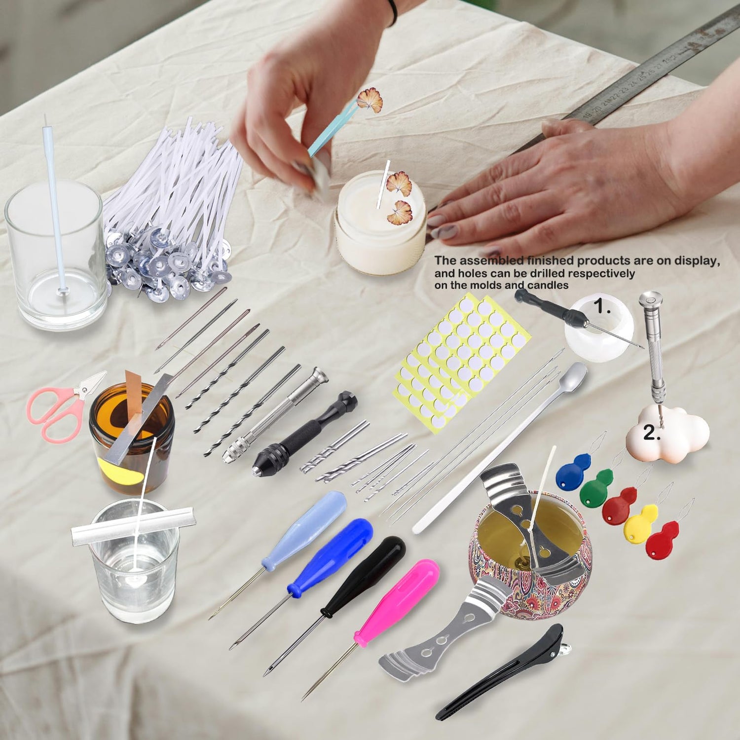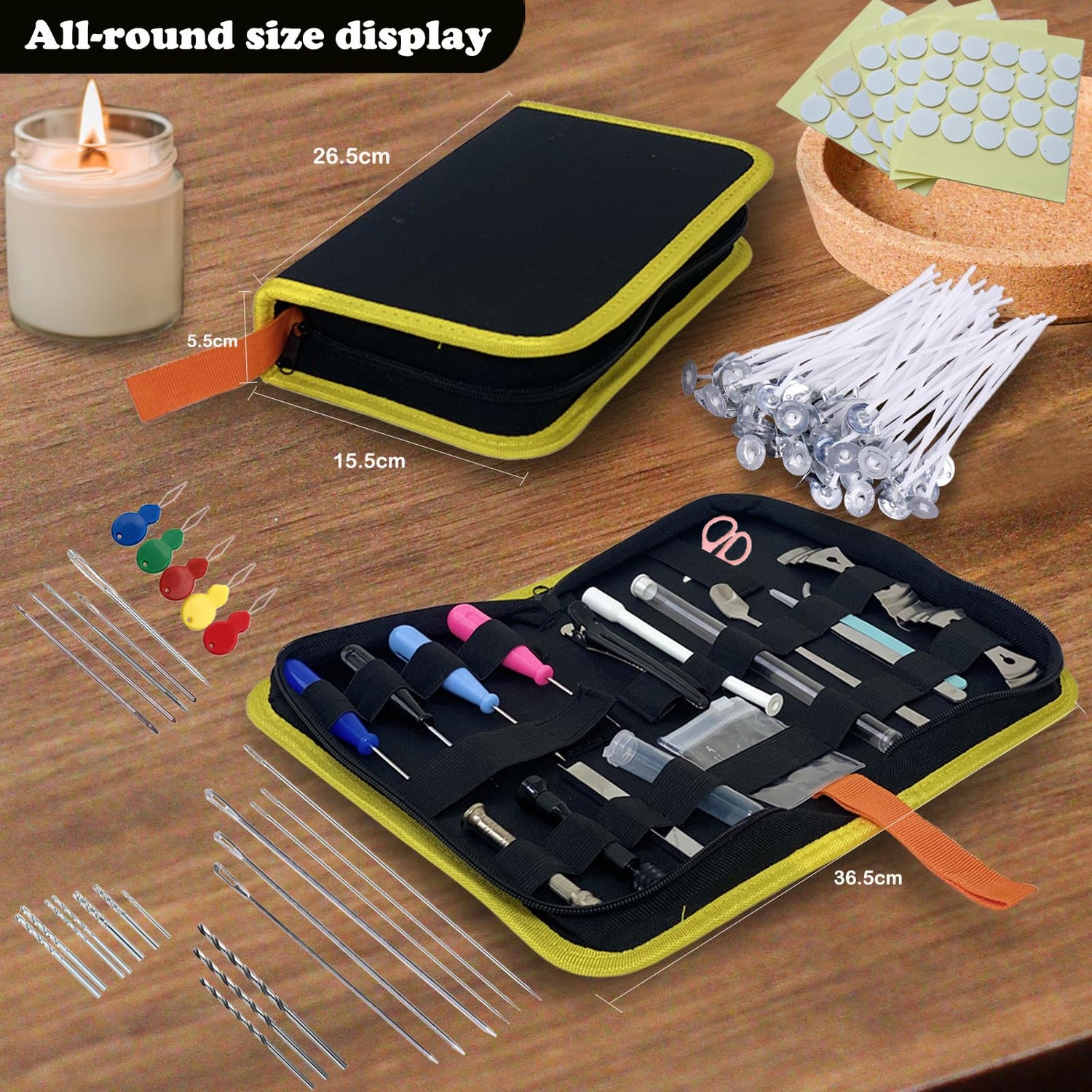 - [Candle Making Kits for Adults Beginners] - Our package contains 150 pieces, 100pcs 6 inches Candlewicks,1pcs Large storage bag ,4pcs mold punch needle with Little thorn sawtooth,holes, hooks, straight needles, 5pcs needle threaders (to be used together with mold punch tool with holes), 7pcs big hole candle wicking needle(7cm~17.5cm),4 pcs candlewick holder,2pcs high-quality thick tweezers,1pcs Candle Wick Placing Tubes,100pcs Candle Wick Stickers with The Little ‘‘Tail’’(5 yellow paper with 20 stickers each),1pcs small scissors,1pcs mixing spoon,19pcs Hand Drill Adjustable Long Needle Punch Wicking Needle Tools & candle drill for wax kits(2 handle and 17 replacement needles/steel sticks)