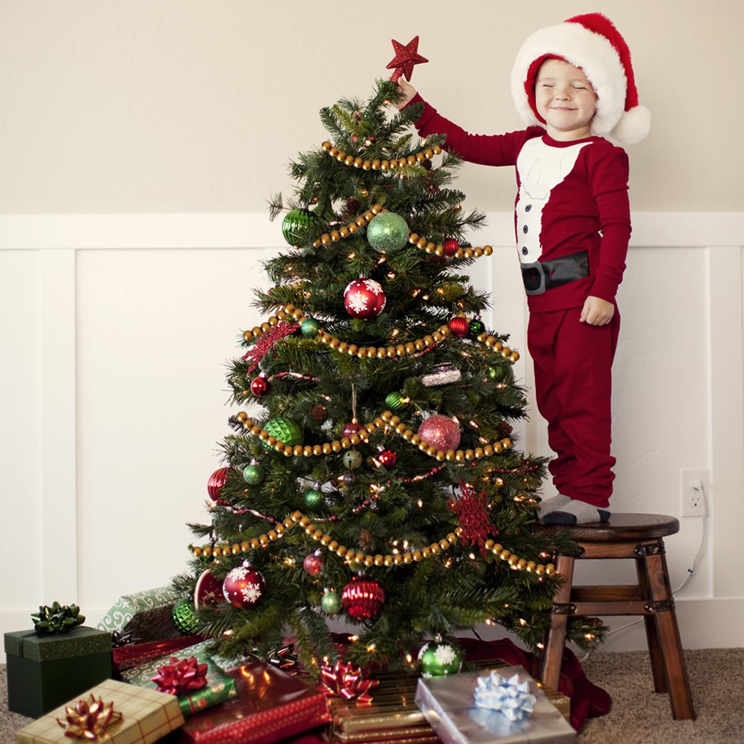 157 inch Christmas Wood Bead Garland,Gold Decorated with Christmas Tree Ornament,Farmhouse Bead Garland for Christmas Decoration Supplies