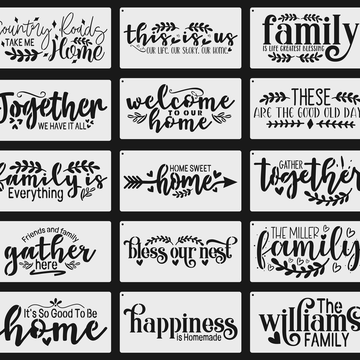 - FARMHOUSE THEMED DESIGNS: This set of decorative, reusable stencils for painting includes 15 large stencils, each measuring 11.8 x 5.9 inches (30 x 20 cm). Featuring popular themes such as "home", "family", "welcome", "together", "luck", "faith" and "home sweet home", these farmhouse family stencils will inspire your creativity and allow you to add a unique charm to your home decor. Impress your friends and family with your DIY skills with these versatile and inspiring designs