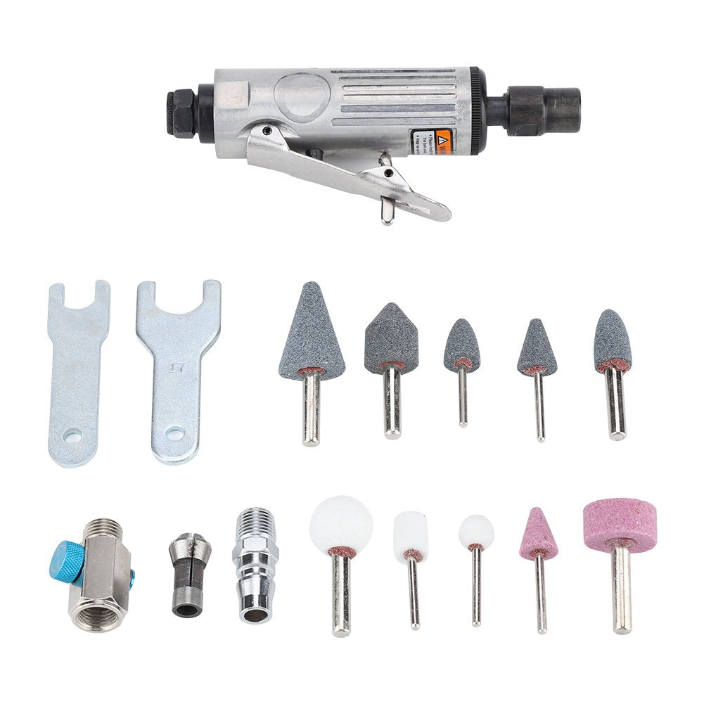 - [Professional Air Grinder Kit]: High quality air die grinder for grinding, polishing, tire grinding, smoothing, rust removal, etc. Comes with grinder, spanner, 3mm(1/8") Chuck/ 6mm(1/4") Chuck and Grinding Head, practical and convenient grinder kit giving complete flexibility for most grinding and polishing needs