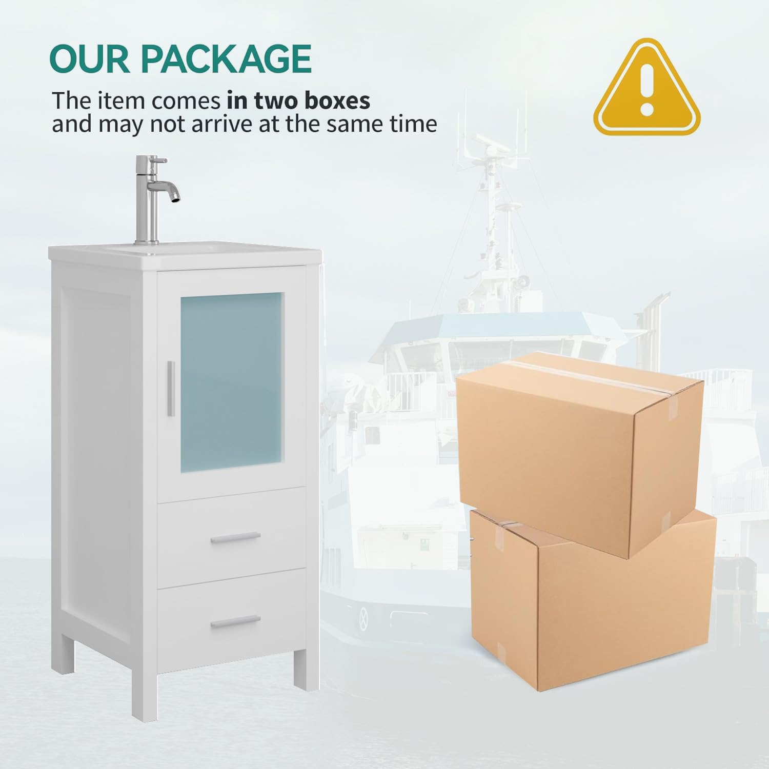- 【Easy to Assemble】Ships in two separate packages, including vanity, ceramic sink, faucet and pop up drain.(Without Mirror)Assembly required, detailed instruction will guide you to finish the installation quickly.Vanity Size: 15.75”L x 15.75”W x 33.46”H. Sink Size: 16.3"L x 16.3"W x 6.9”H.