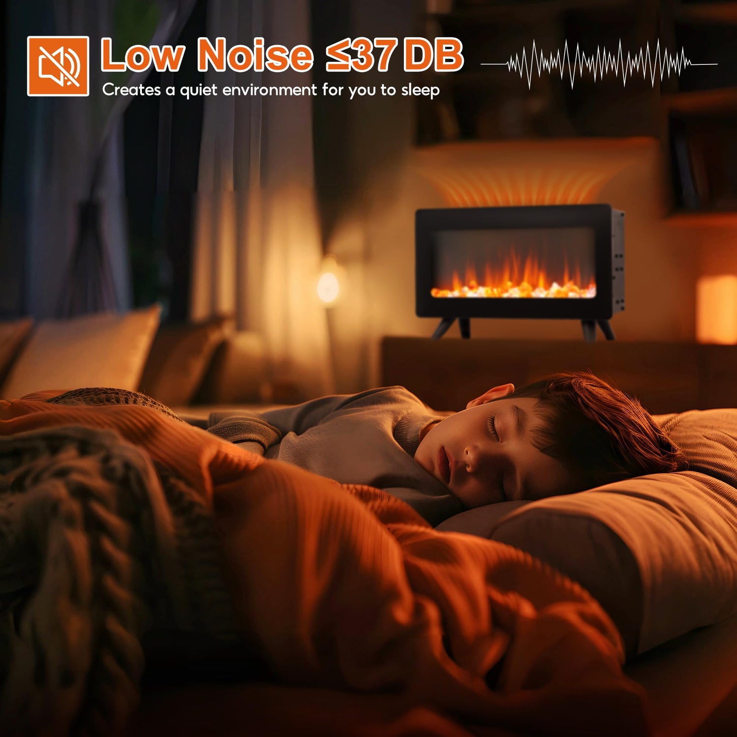 - 3D FLAME: The flame bed of the portable fireplace is designed with crystal stone. Through the illumination of LED light, the jumping 3D flame burns like a real fireplace. The black glass frame wraps the flame. The indoor fireplace is a fashionable heating decoration in any position