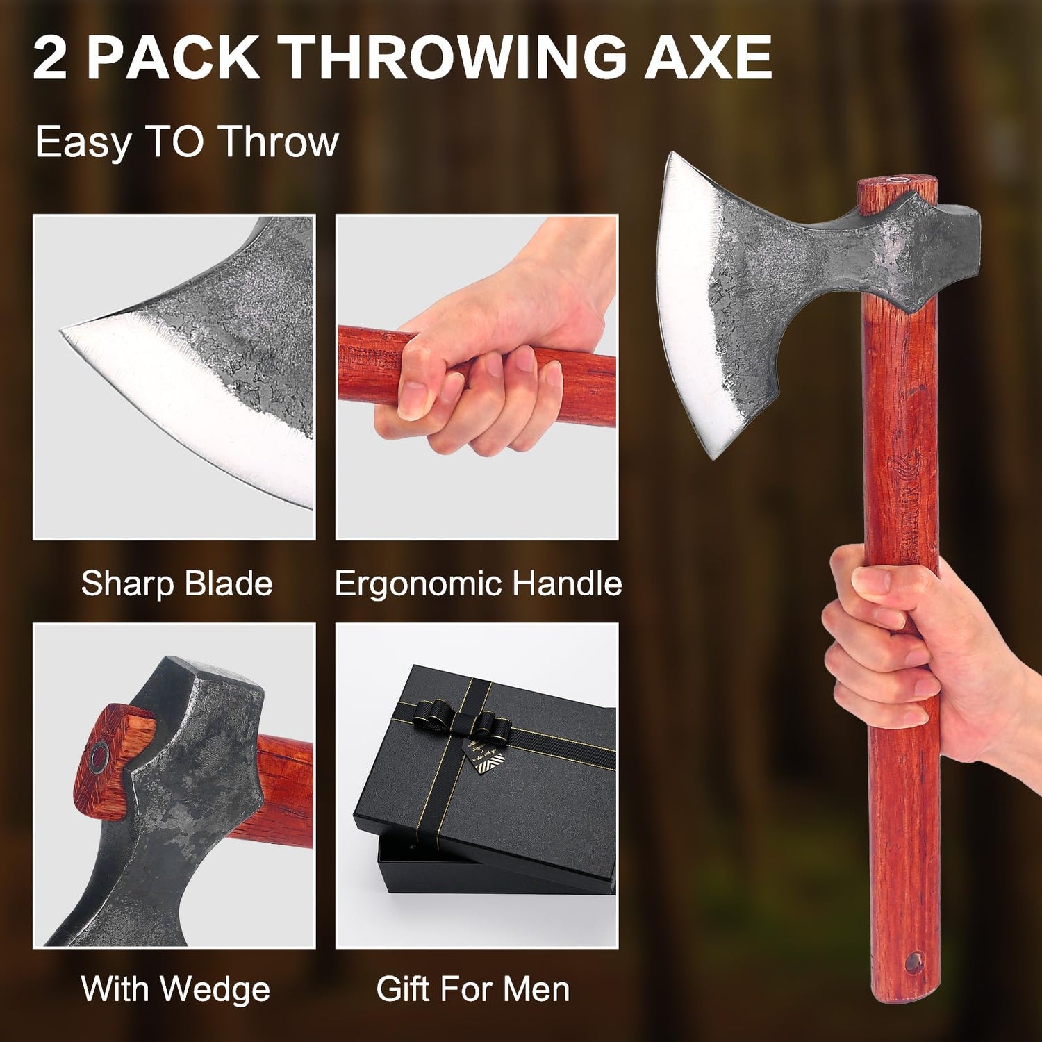 Details: Introducing our 16.2” Professional Throwing Tomahawks! Perfect for beginners and professionals alike, this Viking style throwing axe set will make you stand out in any throwing competition! Crafted with exquisite design and balance, the center of gravity is aligned for smooth rotation during flight to greatly improve your accuracy. Made of high carbon steel, this bearded edge throwing hatchet comes sharp right out of the box, and easily sticks into wooden boards. Unlike other throwing tomahawks, this hatchet axe is built to last with a solid beech wood handle that's strong and durable. With a straight handle design, it provides the perfect balance for smooth throws, and allows for easy release during the throwing process. To minimize the chances of a loose head, we've added a steel wedge to make it tight while assembling. And with the exquisite packaging, it makes for a great gift choice for any axe throwing enthusiasts. What are you waiting for? Get your hands on our Throwing Axe and dominate the competition!
