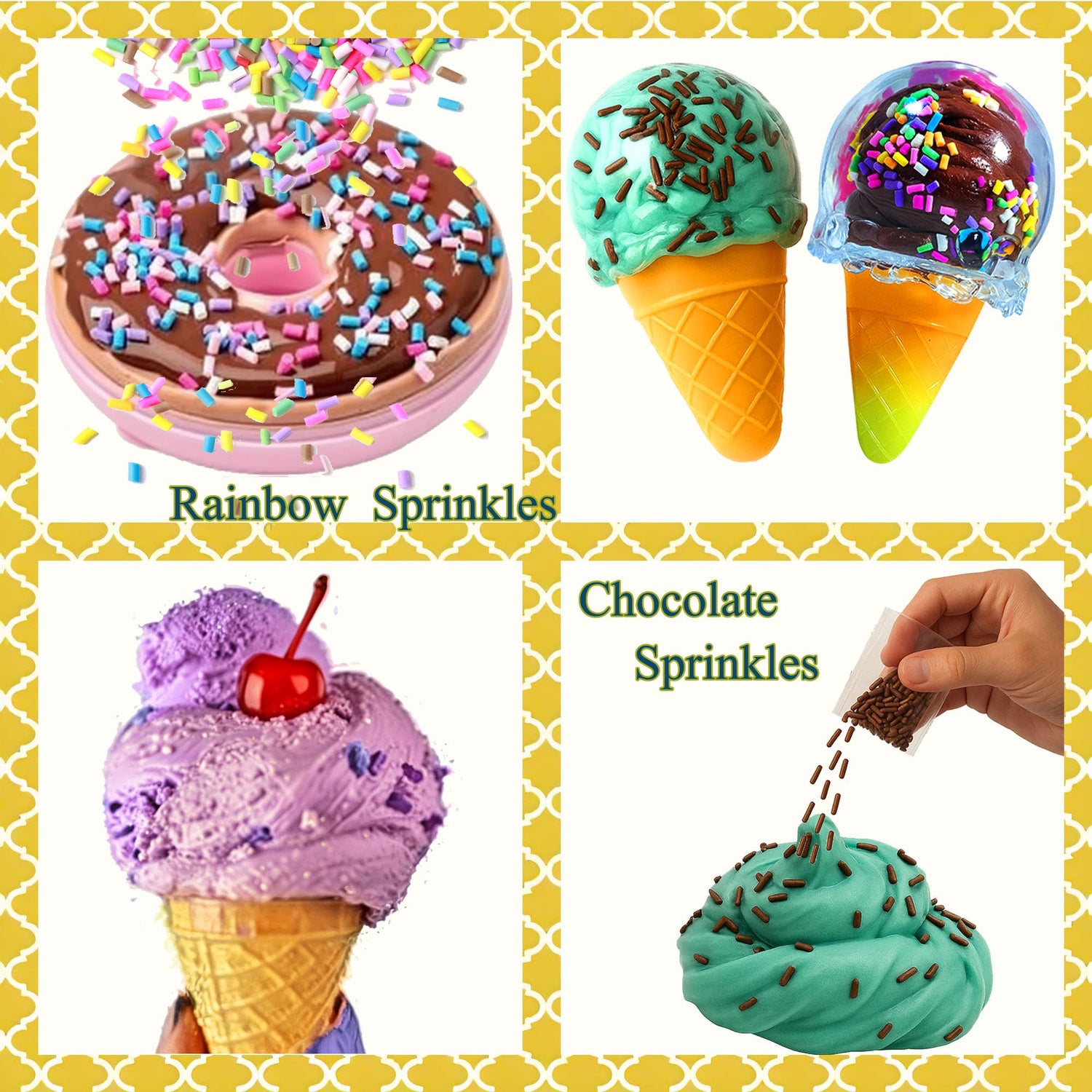 - Slime mix ins include: 39 slime charms, 48 bottles of glitter jars, 42 sheets of imitation gold leaf, 12 packs of sugar papers, 6 packs of foam balls, 3 packs of glitter sequins, 3 packs of fruit slices, 3 packs of fishbowl beads,3 slime tools ,1 pack of rainbow sprinkles and1 pack of chocolate sprinkles, making it easy to create unique slime projects.