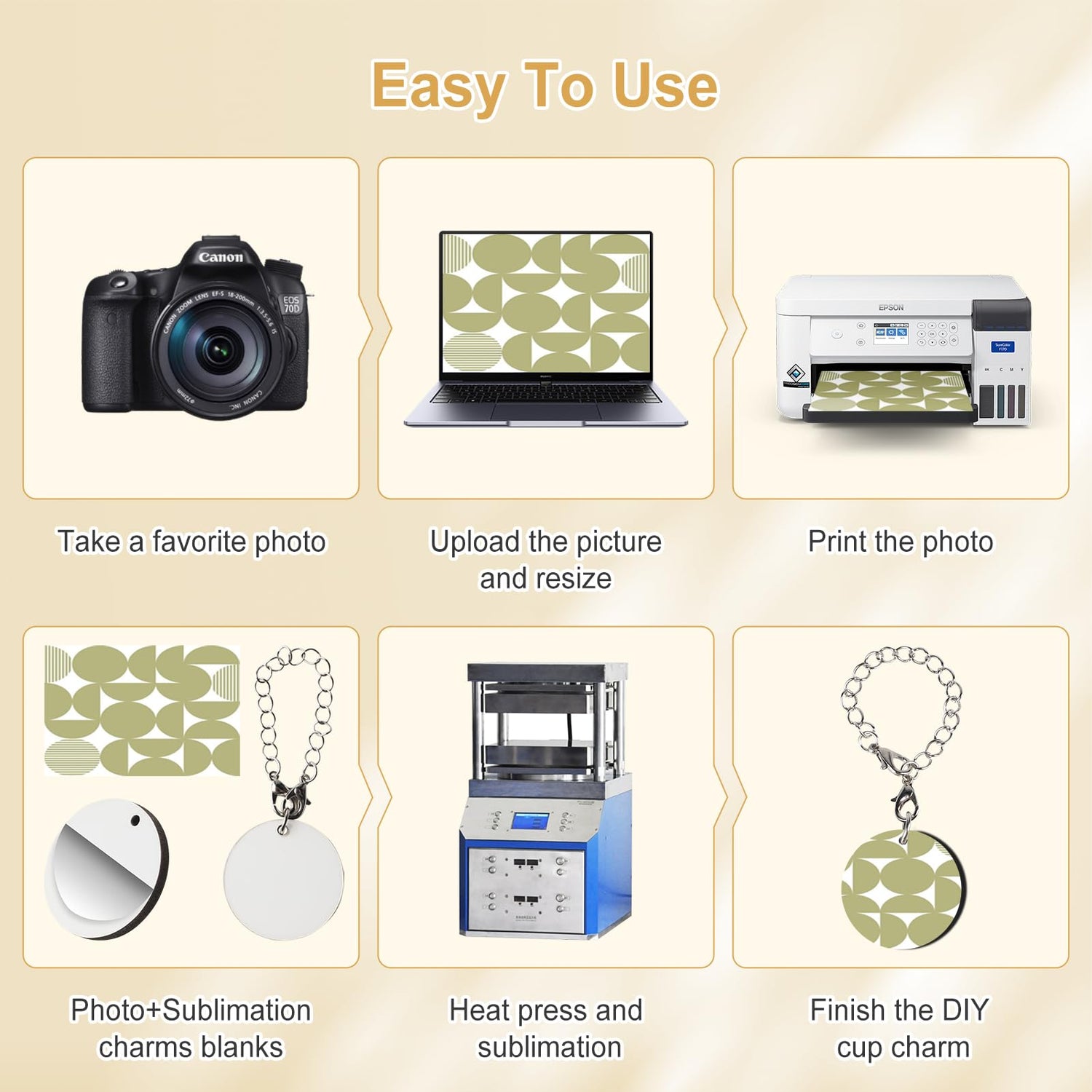 - 【Ease of Use】: Sublimation charm blanks with double-sided blank design can be printed with different patterns,setting the transfer machine to 180 degrees Celsius (356 degrees Fahrenheit) hot pressing for 35-50 seconds.Both sides of the MDF blank are covered with a protective film that needs to be removed before printing. The printed sublimation keychain charm for tumblers images are colorful and perfect for sublimation projects and DIY crafts.