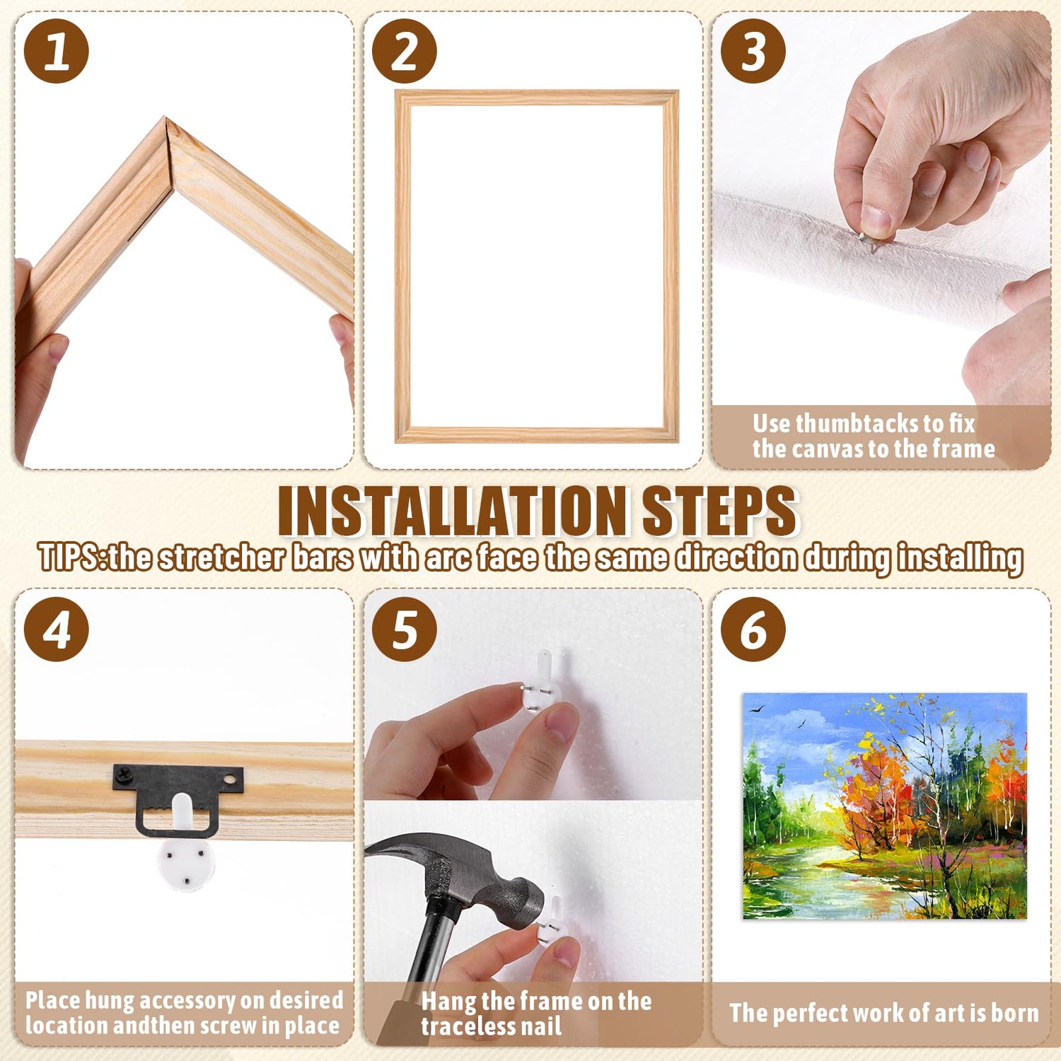 - Complete Frames for Canvas Art: Includes 4 single pine wood stretcher bars (2x16inch, 2x20inch), flat-head thumbtacks, and hanging materials such as seamless nails and hanging nails for an all-in-one solution. Perfect for canvas painting enthusiasts