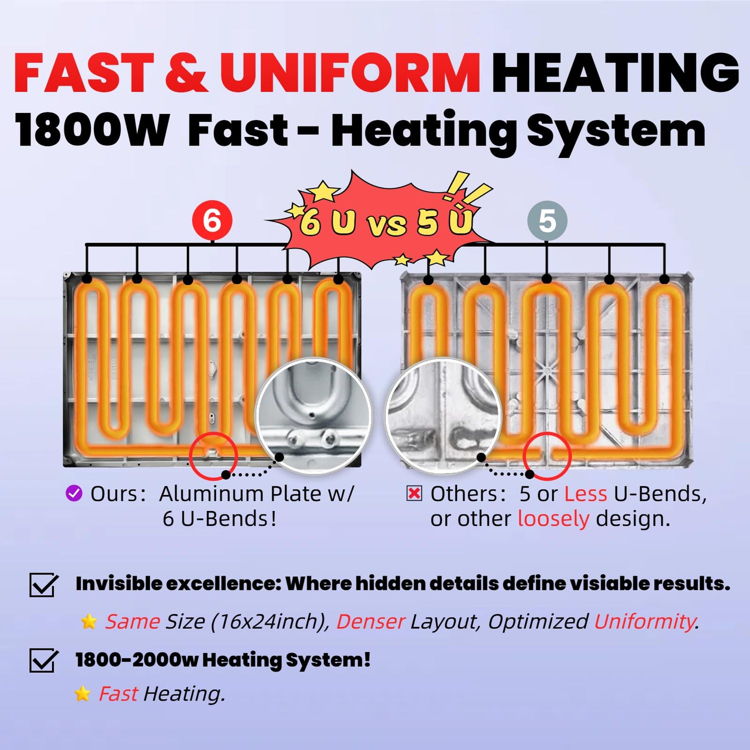- 【Perfectly Even Heat: No More Patchy Transfers!】 Stop struggling with hot spots that ruin designs on shirts or totes! Our 16" x 24" high-pressure manual heat press machine boasts a powerful 1800W heating system and an integrated aluminum-cast heating plate with 12 heating tubes. This ensures uniform, stable heat distribution across the entire surface.