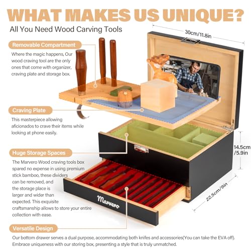 - 🌟 【Unique Carving Box Design】 : This Carving Box is equipped with a bottom Magnetic drawer for you to perfectly store your Carving knives and carry around with pleasure. A Removable Compartment with craving plate and Phone Holder, And it comes with deep storage area, This exquisite craftsmanship allows to store your entire collection with ease