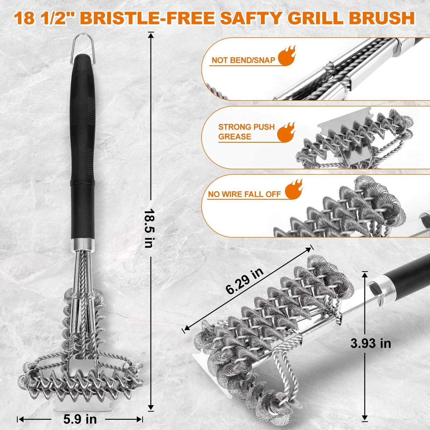- 【The Safest Bristle-Free Barbecue Cleaning Brush】:No wire bristles, no melting plastic bristles grill brushes; With our safe stainless steel grill brush and scraper, your food will be 100% Bristle-Free. No more worry about swallowing any sharp metal pieces;