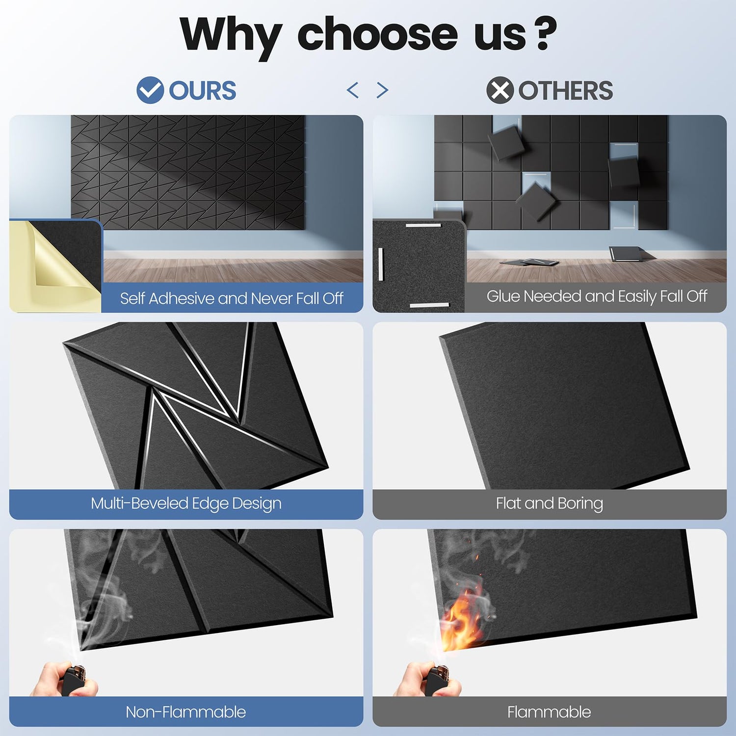 - âăGreatly Save your time and money !ăour soundproof wall panels are self-adhesive,They can be installed to a variety of different surfaces (walls,doors,windows,ceilings and so on) without any tools.No need any other glue.Our acoustic panels come in 18-piece packs, which on average are cheaper than 12-piece packs acoustic panels.