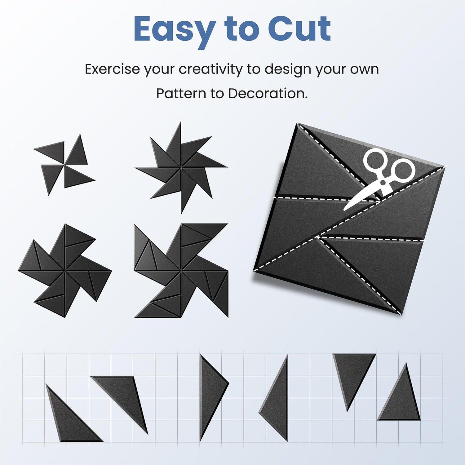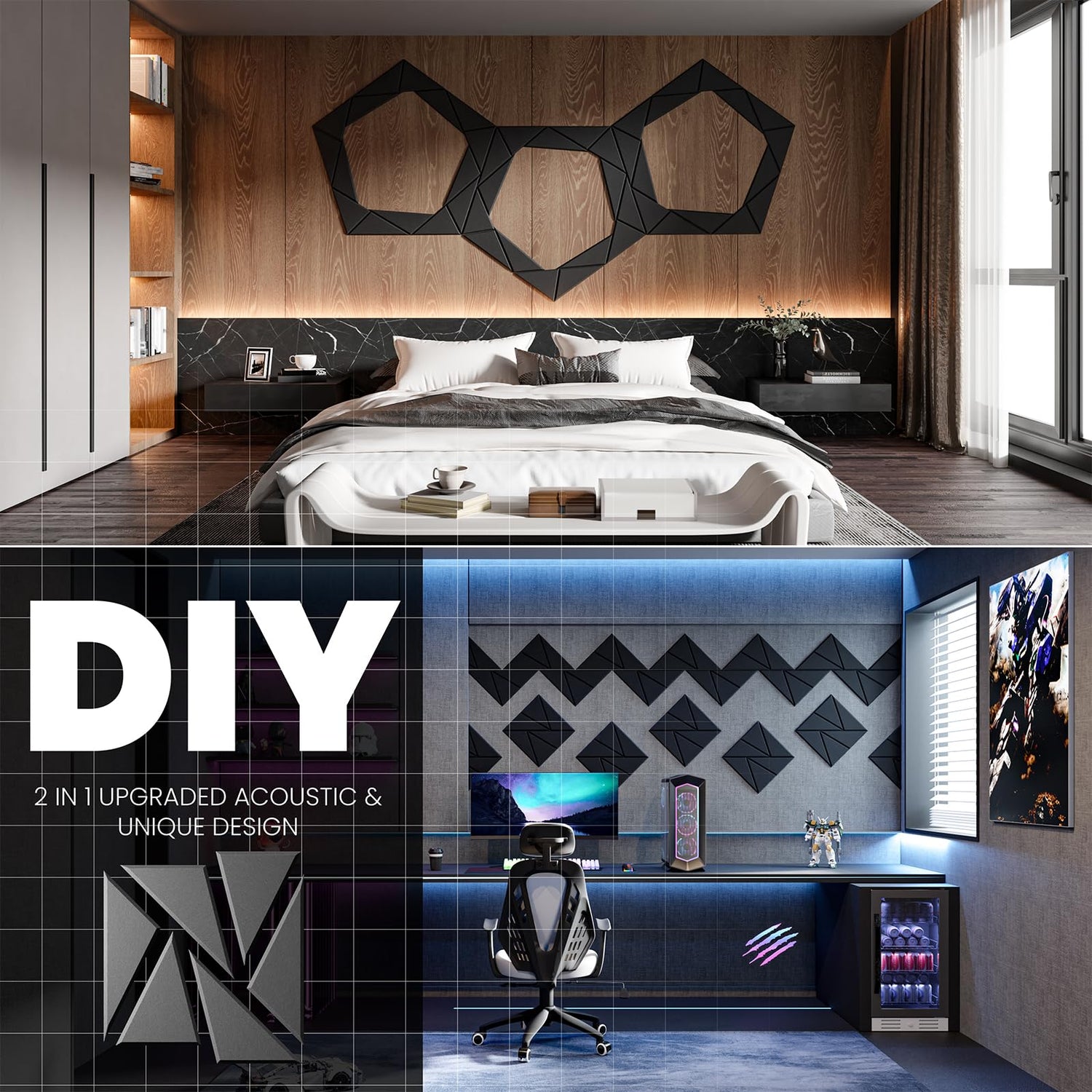 - đăPerfect for wall decorationăBe different from other acoustic panels,We have not only upgraded their acoustic performance,but aslo their appearance.Adopt beveled edge and multi-line design.They can be DIY into pinwheel patterns and multi-ring patterns.They absorb unnecessary sound while playing a good role in decorating the wall.Perfect for professional studios, video blogger,game room, podcasting, school,home theaters,offices,etc.