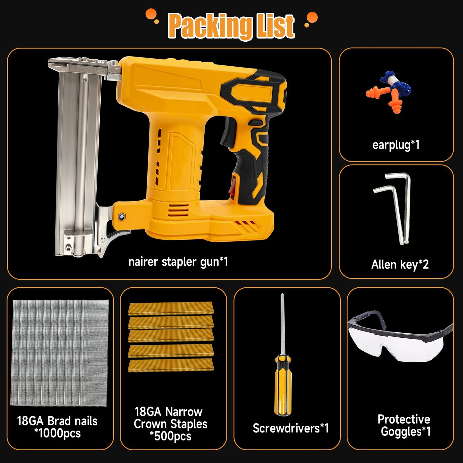 - What You Get: One bare nail gun, 1000 straight nails, 500 U nails, earplugs, glasses, dual-purpose nail gun, screwdriver, 2 hex wrenches