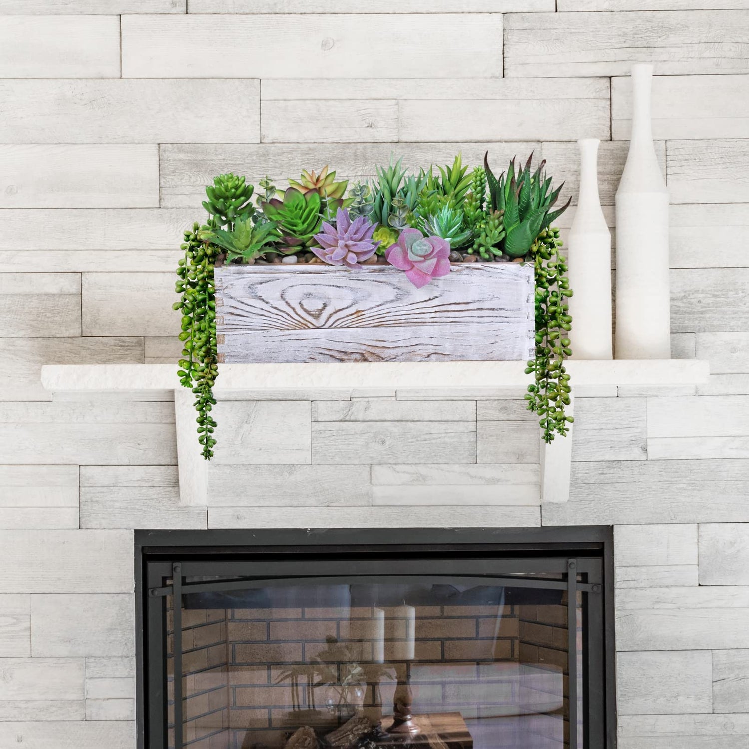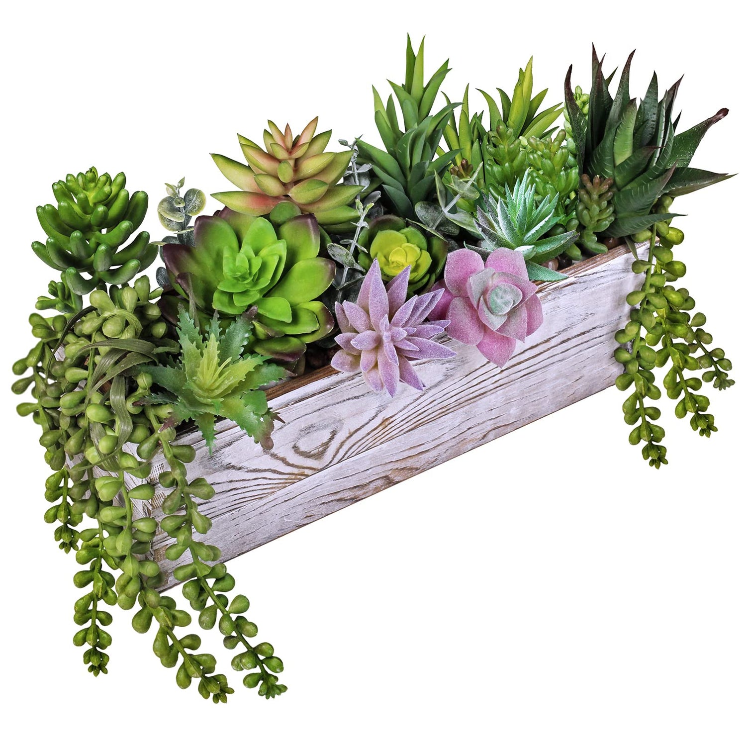 - This fake potted succulent arrangement is overflowing with a massive variety of fake succulents in various shades of green and purple with lots of texture. Assorted lifelike faux succulents and pebbles are tightly arranged in a rectangle wood planter with distressed white finish given a rugged look for a rustic touch. Artificial potted succulent garden bursts with character which will elevate the look of your interior with a touch of vintage, and create a warm and welcoming atmosphere.