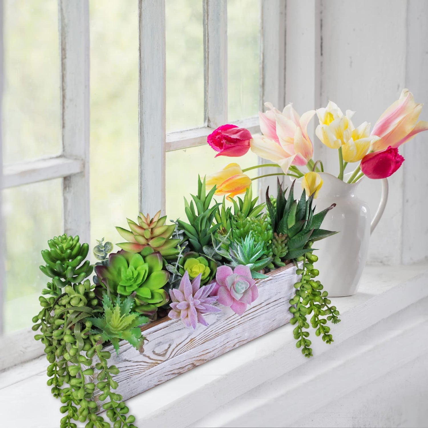 - Quantity: Artificial Pre-Made Succulent Arrangement is a blend of 19 pcs faux succulent plants and greenery arranged in a rustic rectangle wooden planter box. This arrangement includes 2 pcs String of Pearls, Echeveria, Burro's Tail, Aloe, Yucca, Jelly Bean, Molded Wax Agave, Flocked Pachyphytum, Flocked Aloe, and Artificial Eucalyptus Leaves Sprigs are pre-potted in a rustic wooden planter box. The wood planter features a rustic style, perfect for adding a modern farmhouse style and natural green to your home and office.