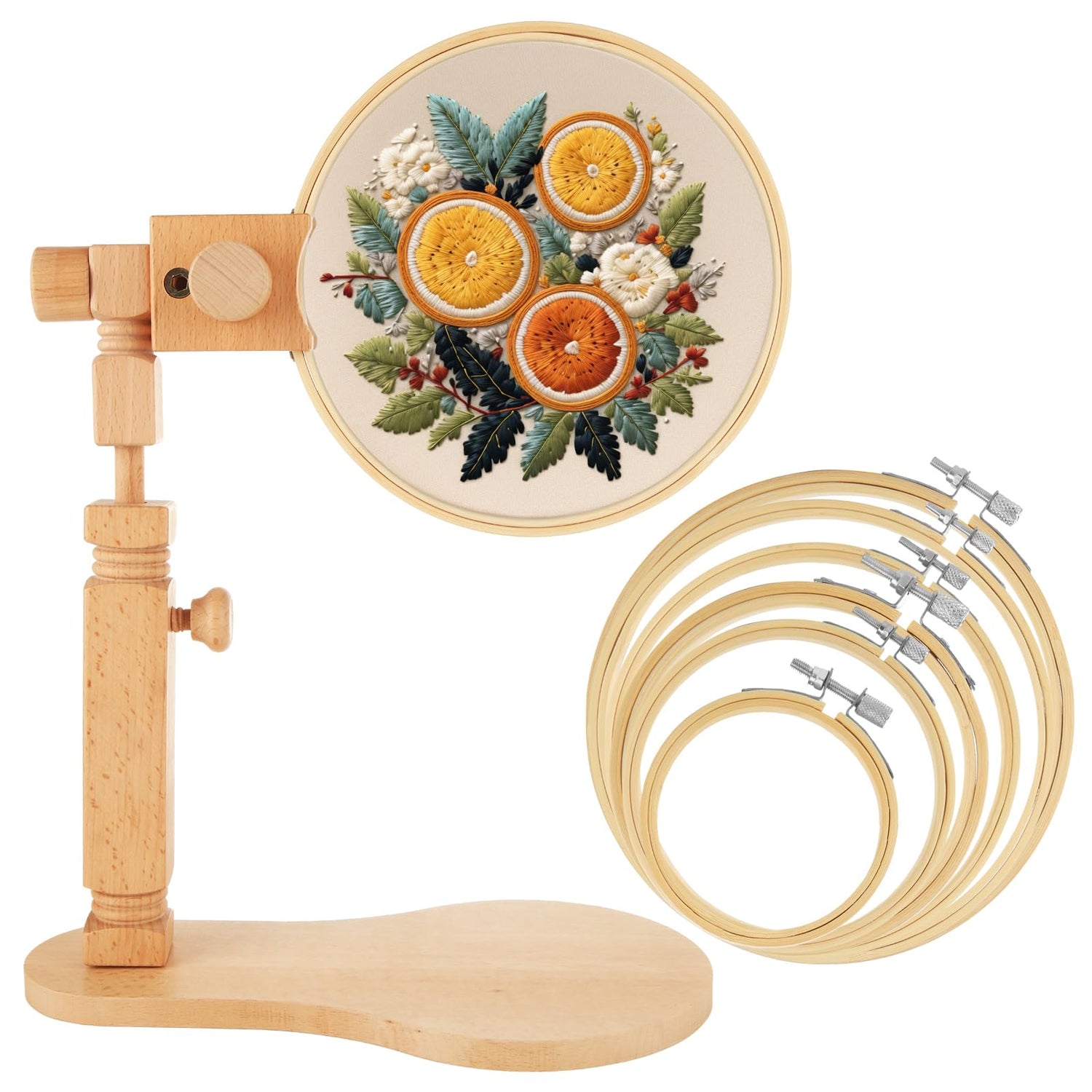 1PCS Embroidery Hoop Stand with 6 PCS 3'' to 8'' Embroidery Hoops Beech Wood Adjustable Rotated Wooden Embroidery Stand, Embroidery Hoop Holder for Cross Stitch and Embroidery Project