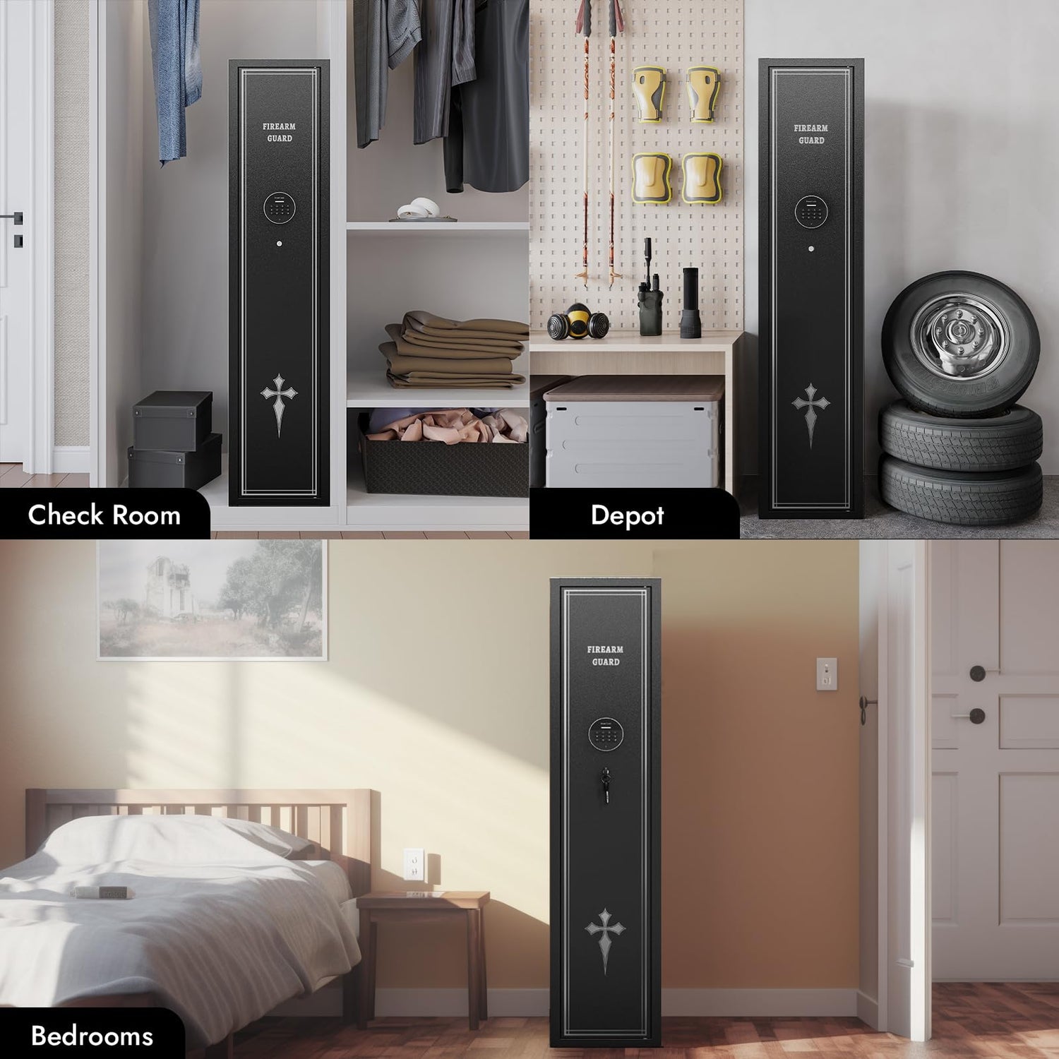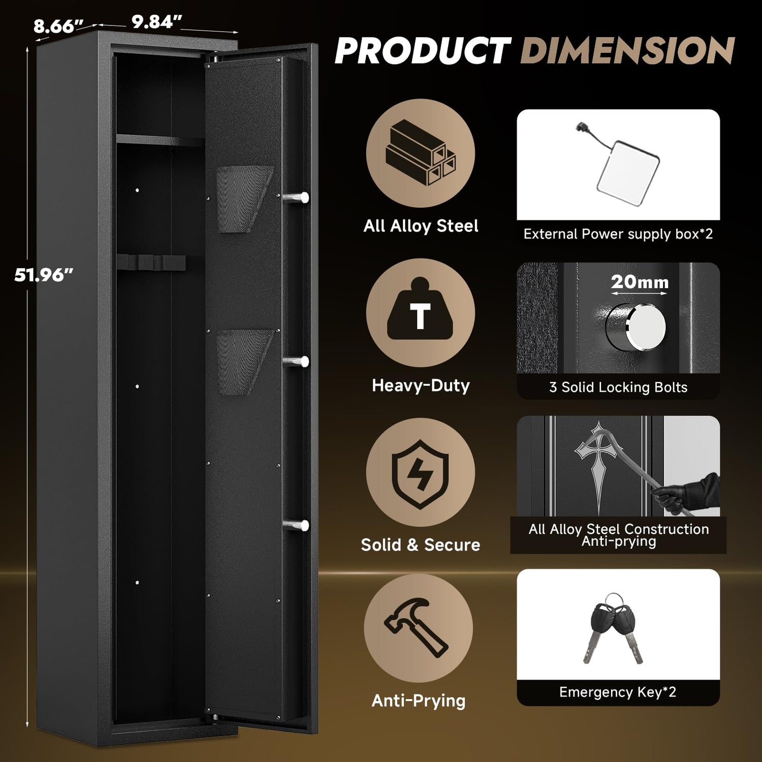 - 【Exquisite Size Gun Cabinet】: The gun safe size is 51.96* 9.84 *8.66 inches, with a compact and efficient design that saves space and meets the storage needs of firearms. The interior space is spacious and can accommodate 2-3 firearms, whether they are handguns safe, rifles safe, or shotguns safe.
