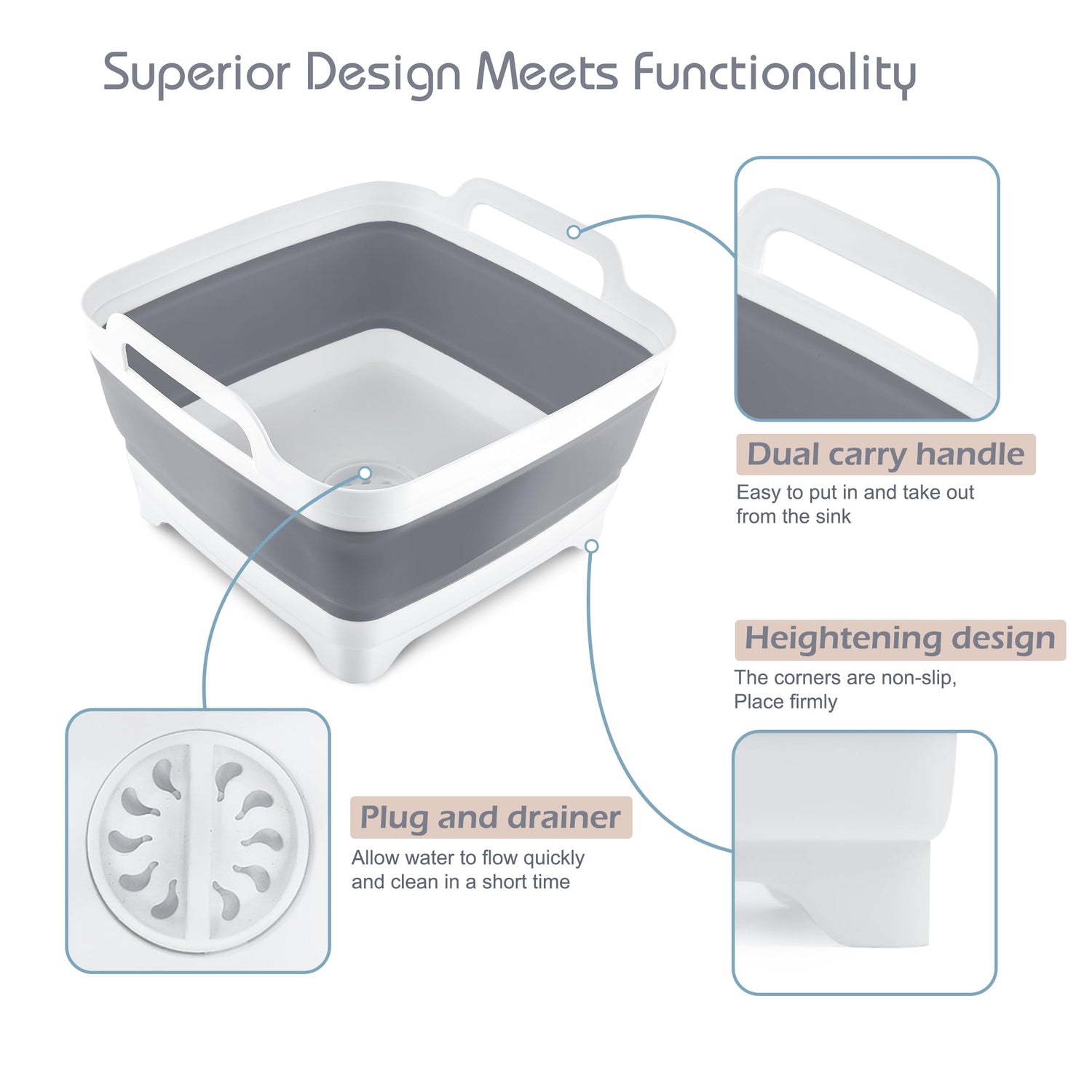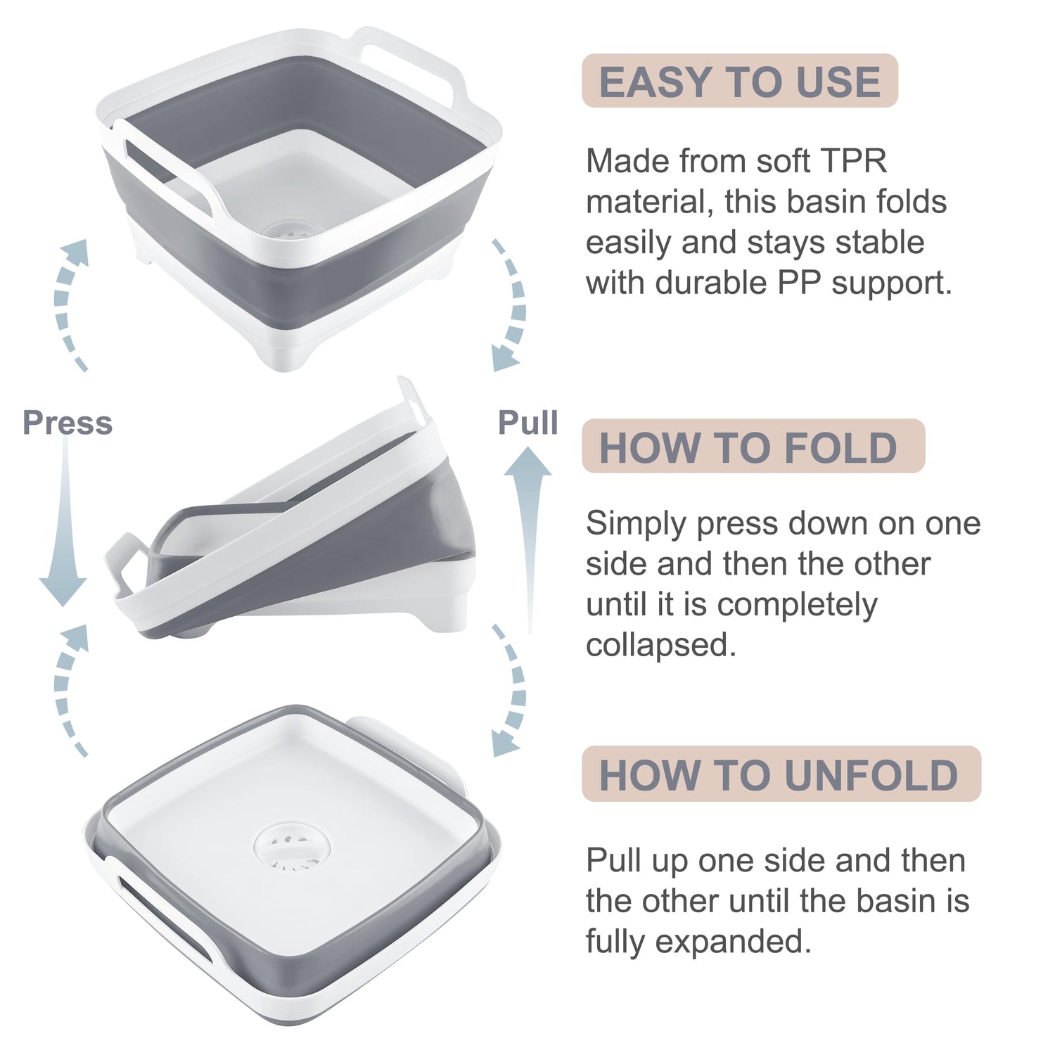 - 【Plug & Drainer Design】The portable kitchen sink and camping sink basin come with a removable drain plug that you won't lift to drain. The collapsible dish drainer is suitable for washing dishes, bowls, vegetables, and pump parts.