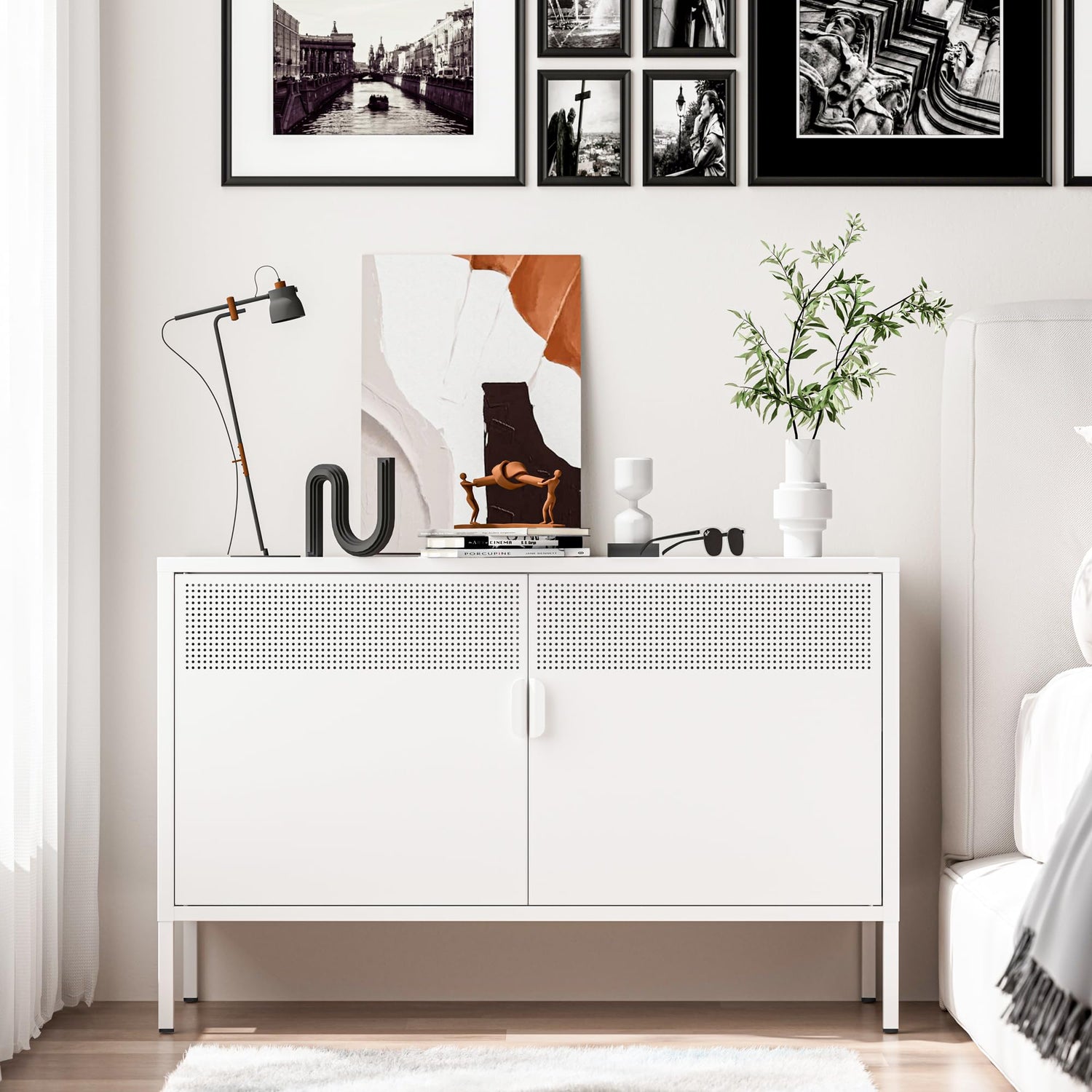 2 Door Storage Sideboard, Metal Storage Cabinet with 2 Adjustable Shelf,Multipurpose Metal Accent Cabinet for Office Home,Music Studio (White, 25''H)