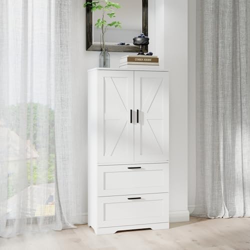 2 Door Tall Kitchen Pantry Storage, Collection Food Free Standing Wooden Storage Cabinet with 2 Drawers and Adjustable Shelves, Modern Farmhouse Versatile Storage for Kitchen, Dining Room (White)