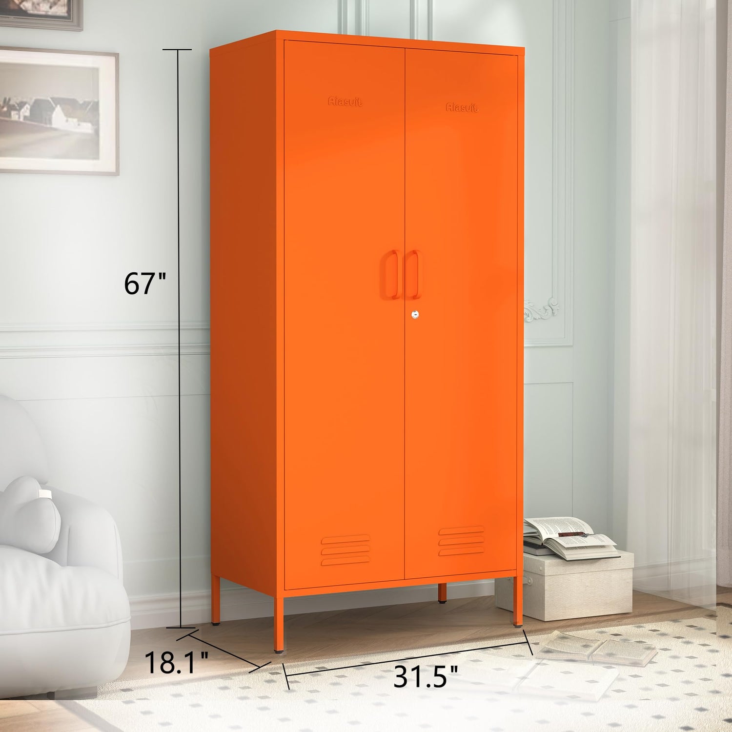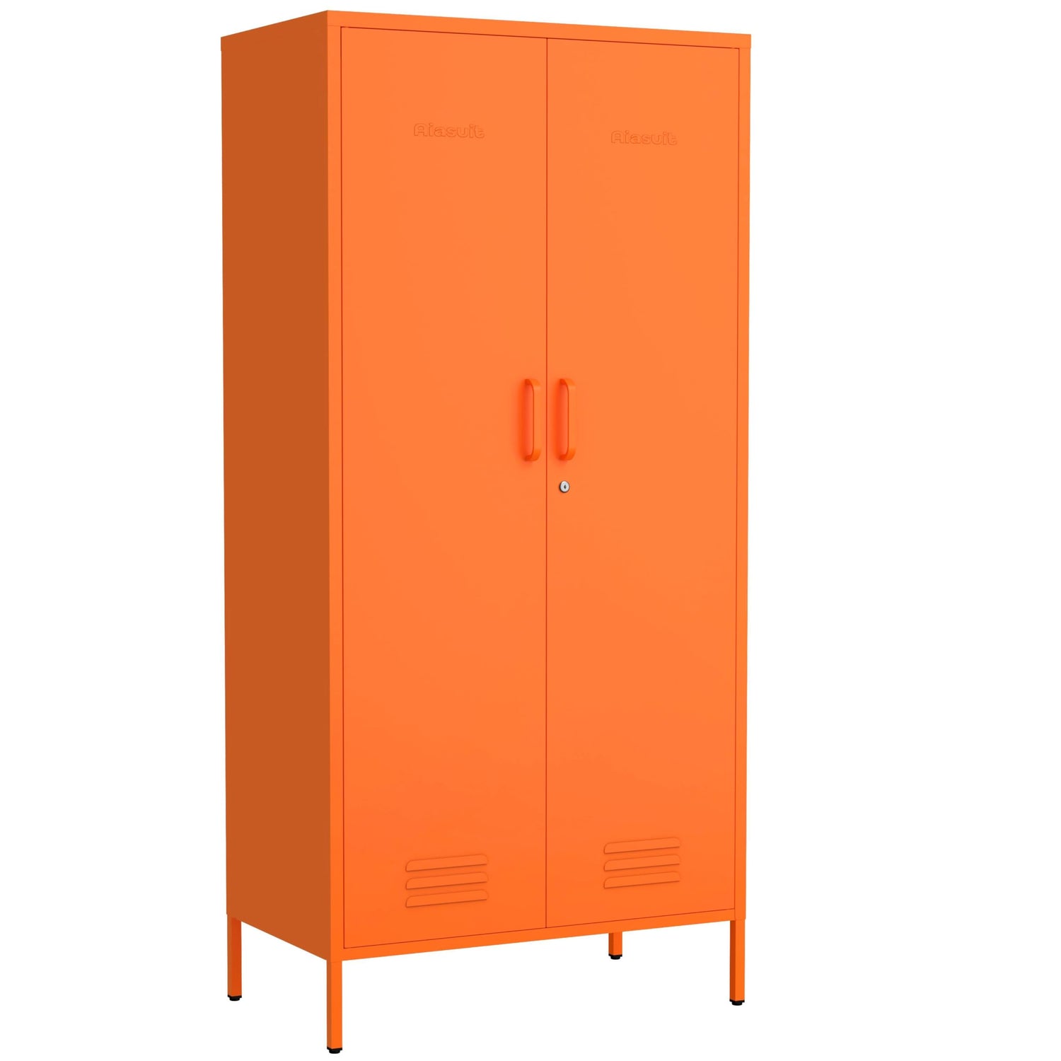 2 Door Wardrobe 67 Inch Orange Metal Storage Cabinet with Hanging Rod, Office Double Door Lockable Metal Adjustable Shelves Wardrobe Bedroom Home Office Storage Cabinet Size: 67"H x 31.5"W x 18.1"D