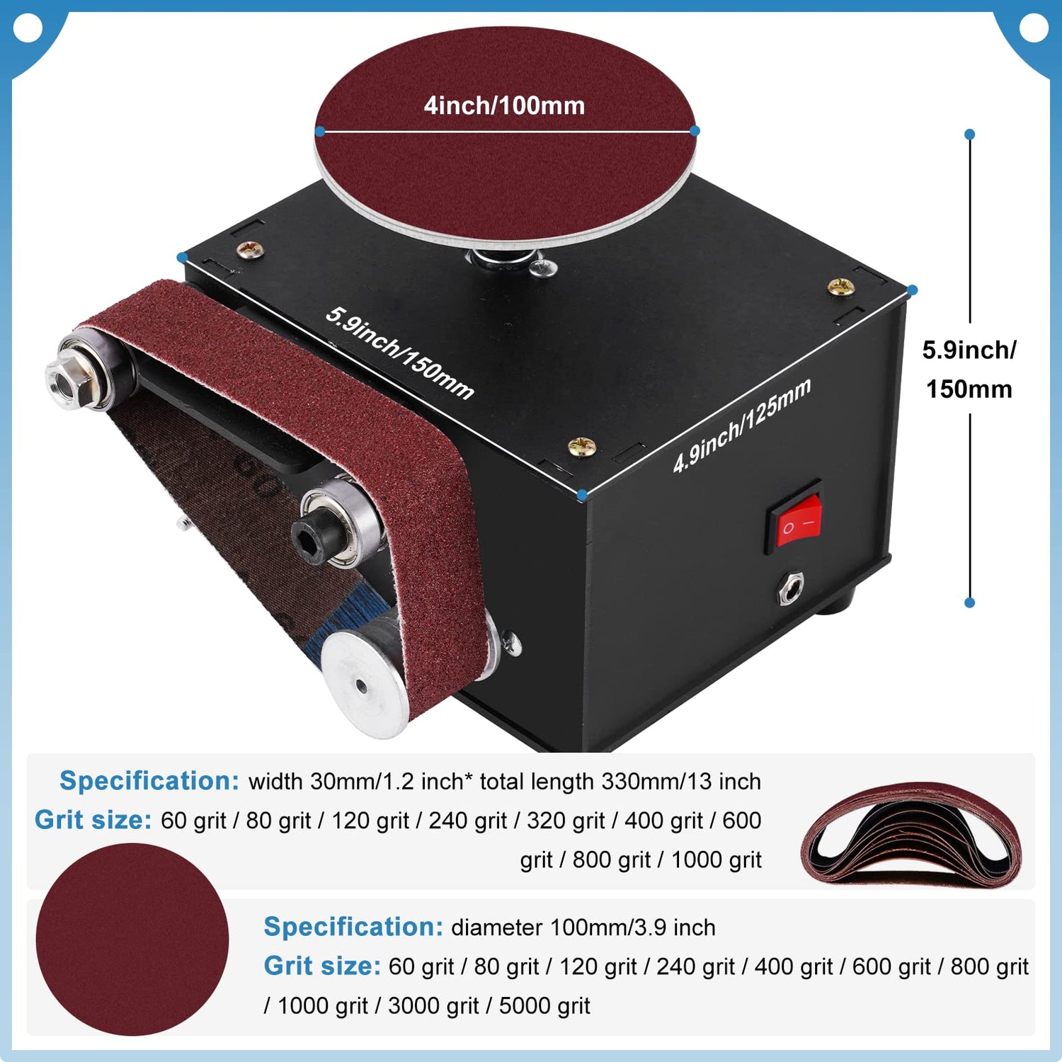 - 【Package includes】Mini belt disc sander x 1, 1.2”x13” Sanding belt x 10, seven-speed power supply x 1, Power cord x1, Hexagonal wrench x 3, Connecting rod x1, 4” Sanding disc x 1, 4” Sandpaper x10.