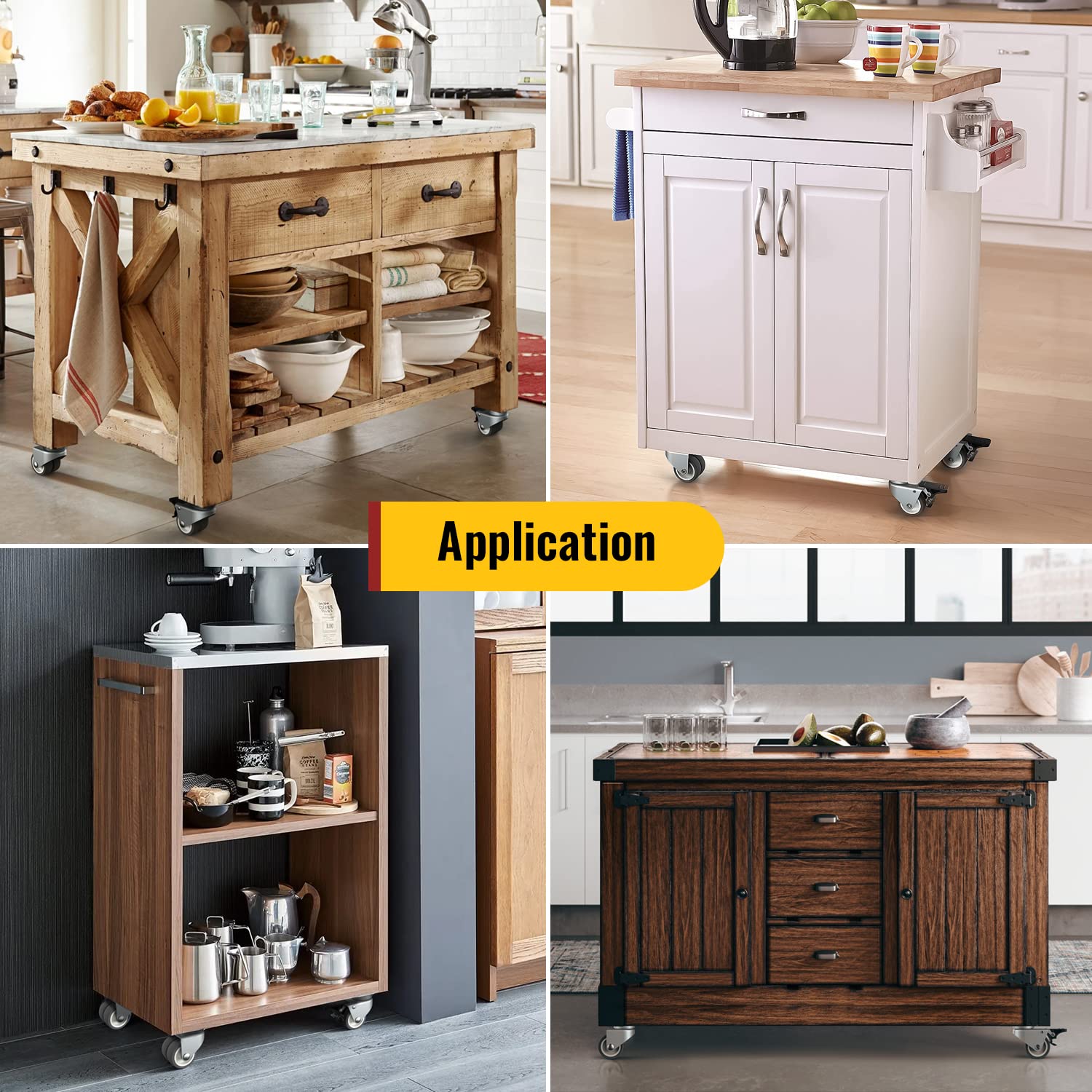 - WIDE APPLICATION: These heavy duty caster wheels are versatile and suitable for various uses. They can be applied to a wide range of furniture, including cabinets, kitchen carts, islands, sofas, bookshelves, wardrobes, and more.