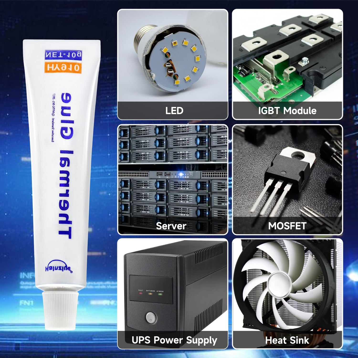 • High Thermal Conductivity - With a thermal conductivity rate of 0.975W/m-K, this thermal conductive glue helps disperse heat effectively from MOSFETs, LEDs, ICs, GPU chipsets, and other electronic components that require direct bonding. It is suitable for all heatsinks without a fixed clip, and can be used for a wide range of applications.