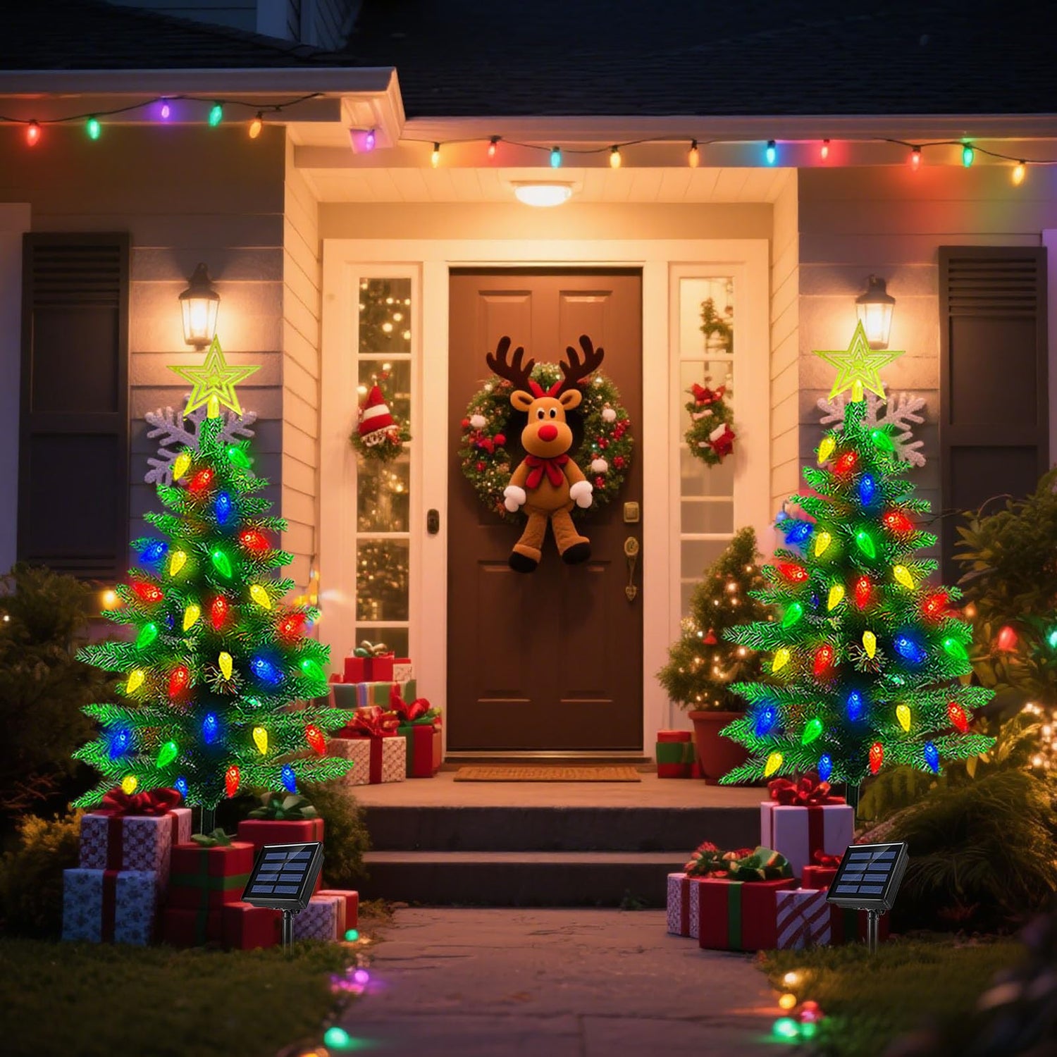 - Upgraded 2 Packs 3.6Ft Solar Christmas Trees: 2 packs Prelit Christmas trees, each xmas tree with 100 branches, looking full, 3.6Ft perfect size with natural green look, wrap with 50 led C6 Christmas lights, adds vibrant festive touch for Outdoor Christmas decorations, front entrance doorway, front porch, walkway, driveway, outdoor pots, graveside, yard, garden