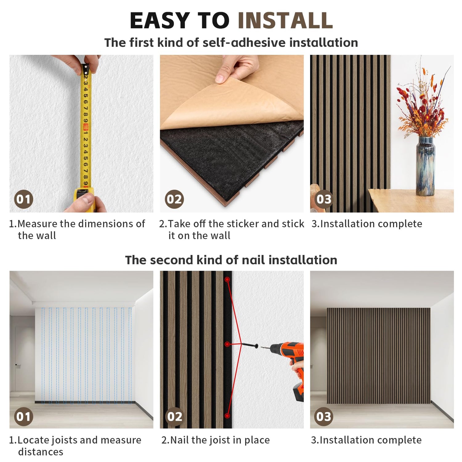 - Two Installation Options for Any Need For the wood slat wall panels can Choose peel-and-stick installation (no tools, damage-free for renters) or screw-mounting (heavy-duty, permanent fixation for concrete walls). Both methods are DIY-friendly—simply align, attach, and enjoy a noise-free space in hours. No professional help is required.