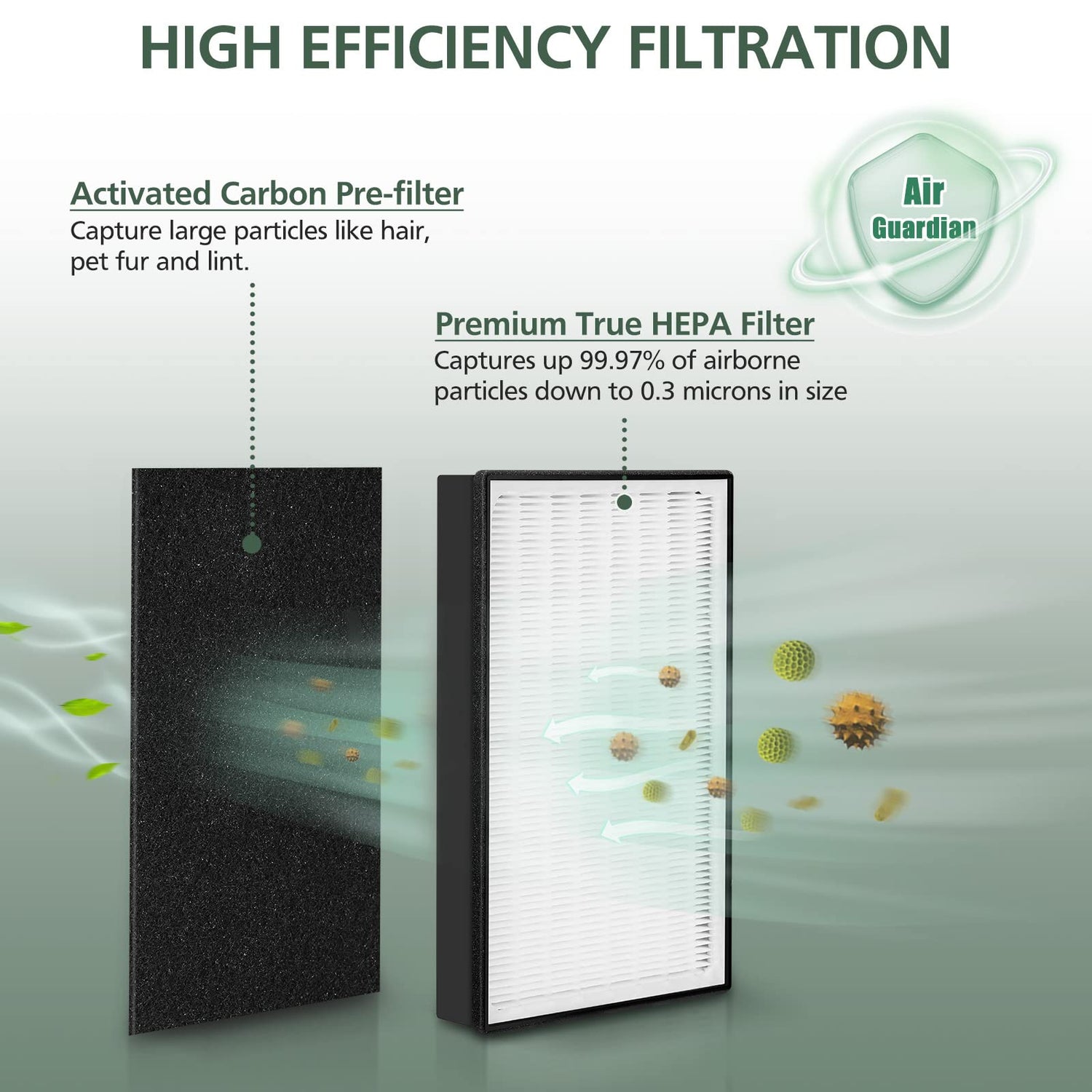 - Package includes 2 HEPA filters plus 2 Carbon pre-filters.Easy to replace: No tools needed when replacing filters. Replace filters every 6 months for optimal performance or depend on usage.Filter made of FSC-Certified paper