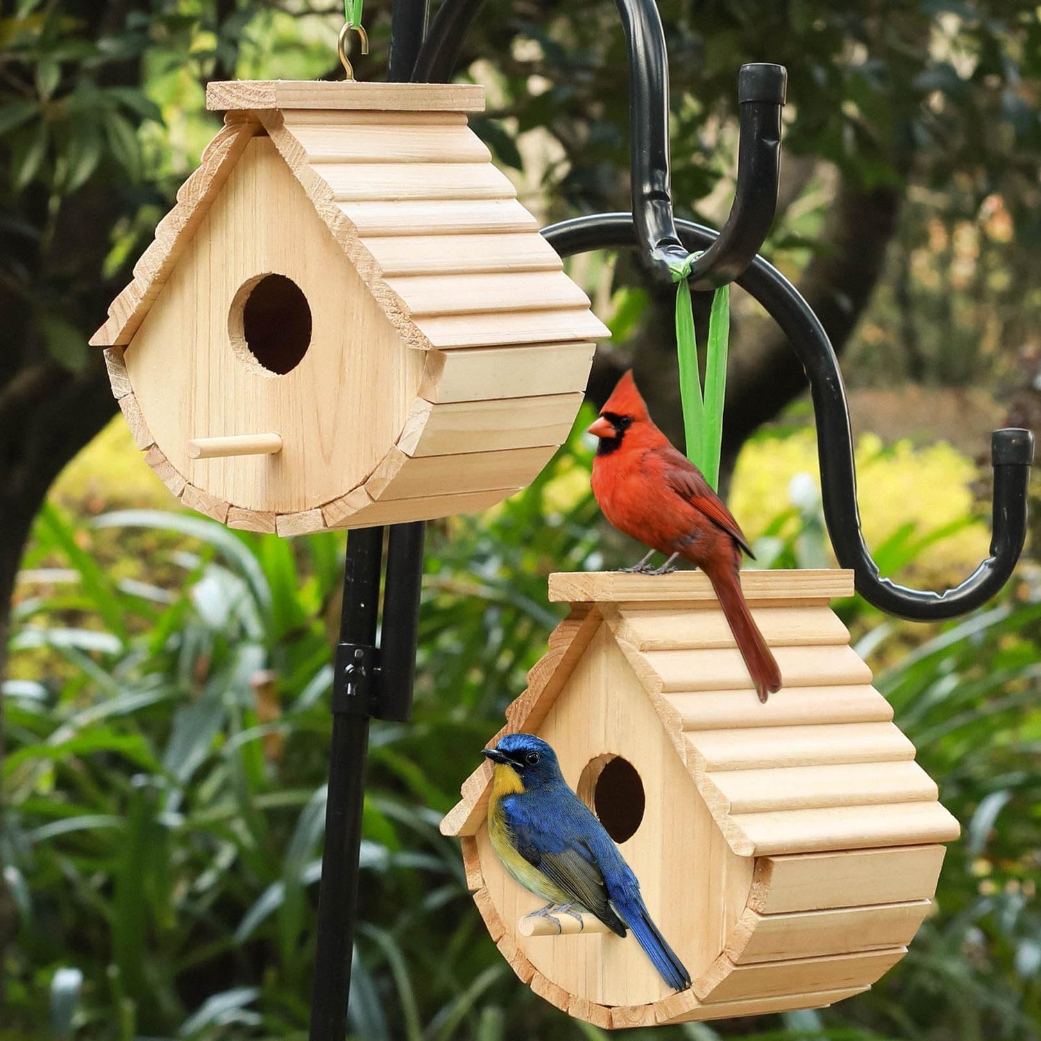 Details: With this set of two hanging birdhouses. Crafted from durable wood, these charming outdoor birdhouses provide a cozy nesting spot for bluebirds, finches, cardinals, and other feathered friends.
