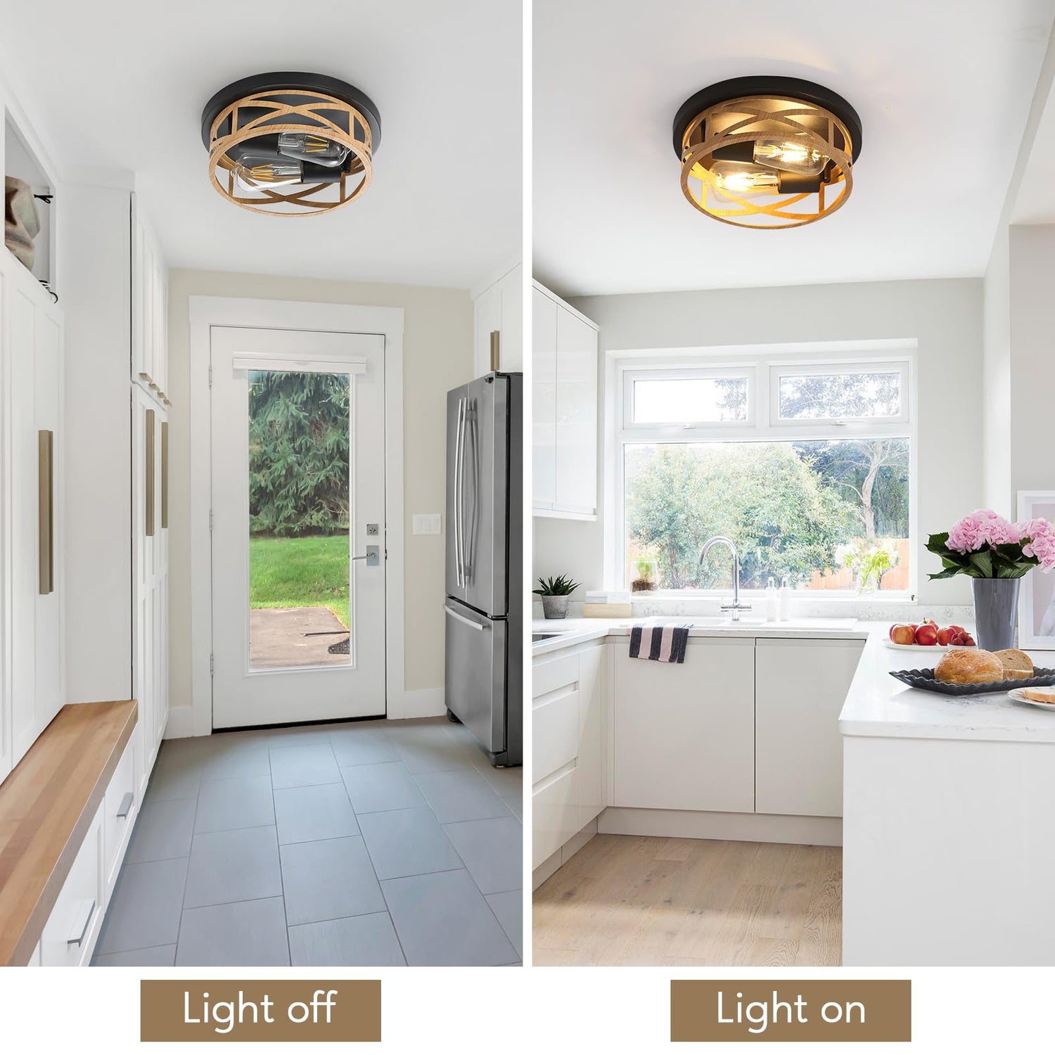 2 Pack Close to Ceiling Light Fixtures, 2-Light Indoor House Flush Mount Ceiling Light, 11 Inch Metal Cage Cross Wood Finish Farmhouse Ceiling Lights for Kitchen Hallway Bedroom