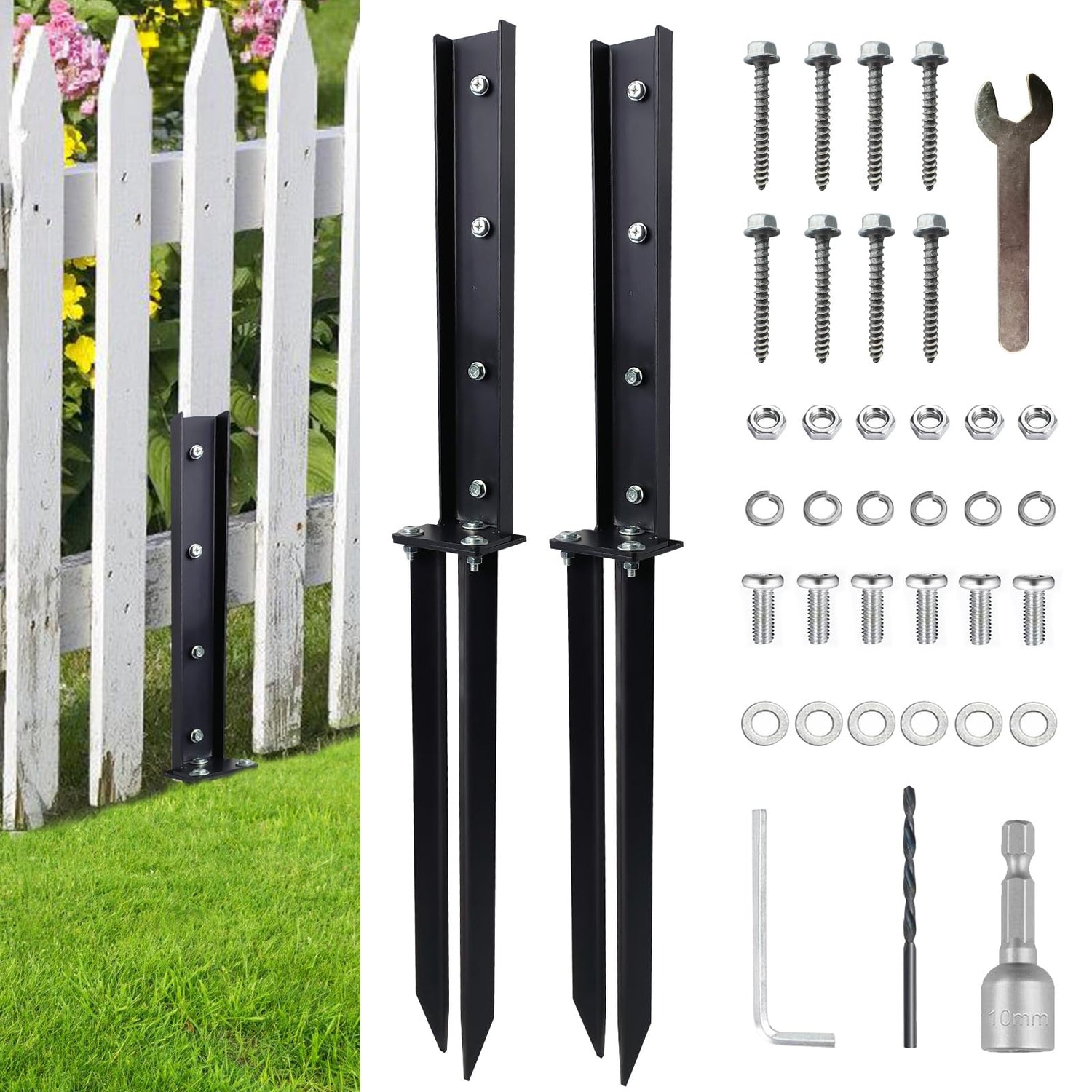 2 Pack Fence Post Repair Kit, Fence Post Anchor Kit, Heavy Duty Steel Fence Post Repair Stakes, Fence Post Anchor Ground Spike for Repairing Tilted Broken Wooden Fence Post, Black