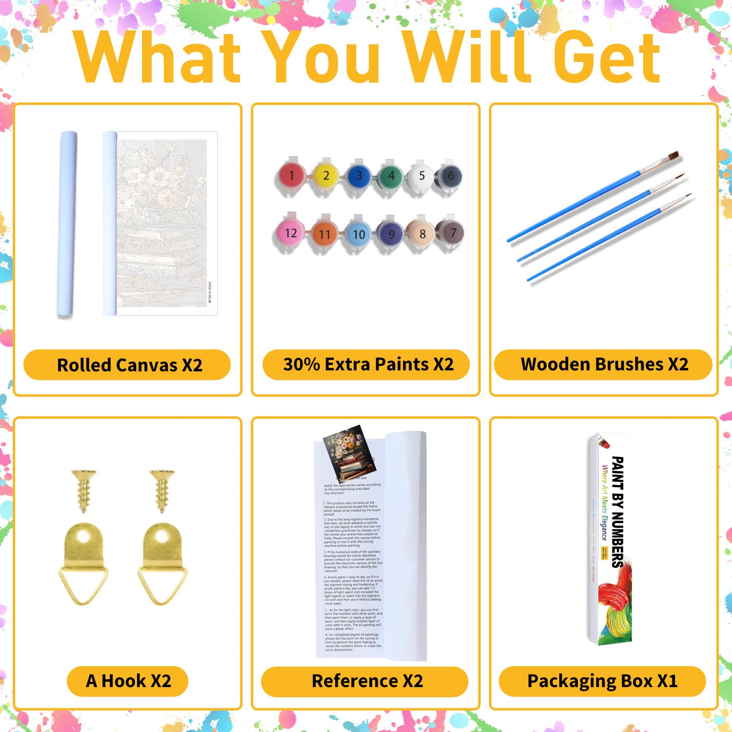 - 【Craft Your Own Painting】 DIY 2 pack rolled book paint by number for adults is easy and fun. Just follow the numbers on the canvas with the corresponding paint, and you will get a materspiece that is created by youself.