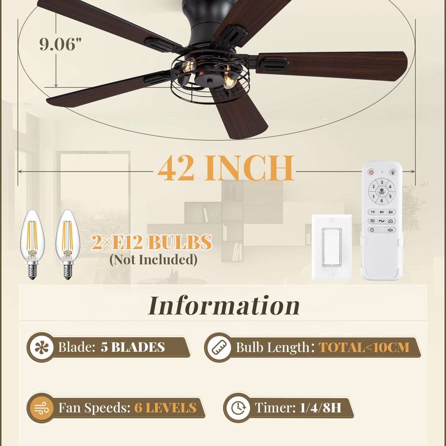 - Easy Installation and Mounting:This large ceiling fan provides all mounting hardware and installation instructions for quick and easy installation. Attached 6 inch down rod can be mounted on sloped ceilings up to 15°. Note: Need two E 12 socket bulbs (Bulbs not included)