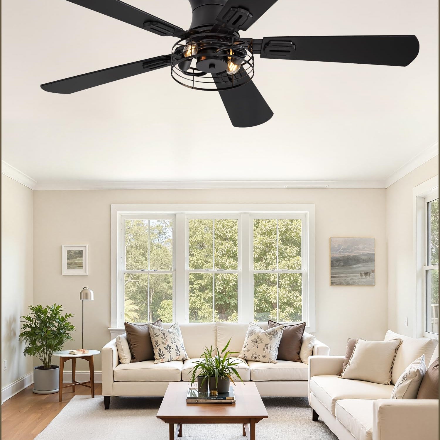 2 Pack Flush Mount 42 Inch Farmhouse Ceiling Fan with Light, Caged Ceiling Fans for Bedroom Living Room, Double-Sided 5 Blades Rustic Ceiling Fan-Black