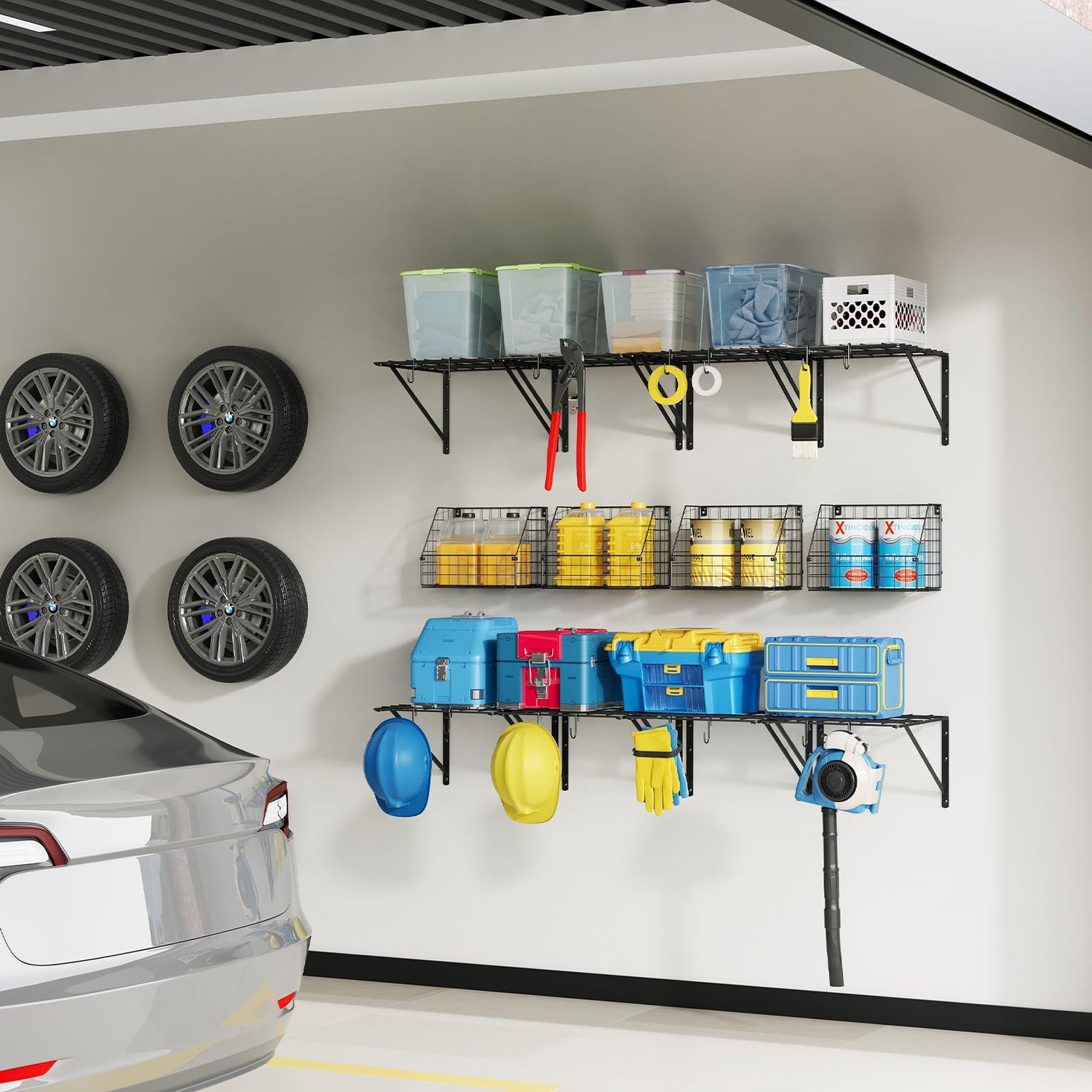 - γππππππΎπ ππππ ππππΌπππππ πππππγ: Our heavy-duty garage shelving can be easily installed in various configurations to meet your specific space requirements, providing you with a versatile storage solution. It can be combined together or used individually. Heavy duty shelves wall mount can accommodate large items such as toolboxes and boxes, freeing up floor space in the garage. Long hooks can be used to store bicycles, helmets, shovels, ropes, ladders, brooms, and other garage and agricultural items. Baskets are perfect for organizing small items like bottles and cans. It's a comprehensive storage solution that caters to all your needs.