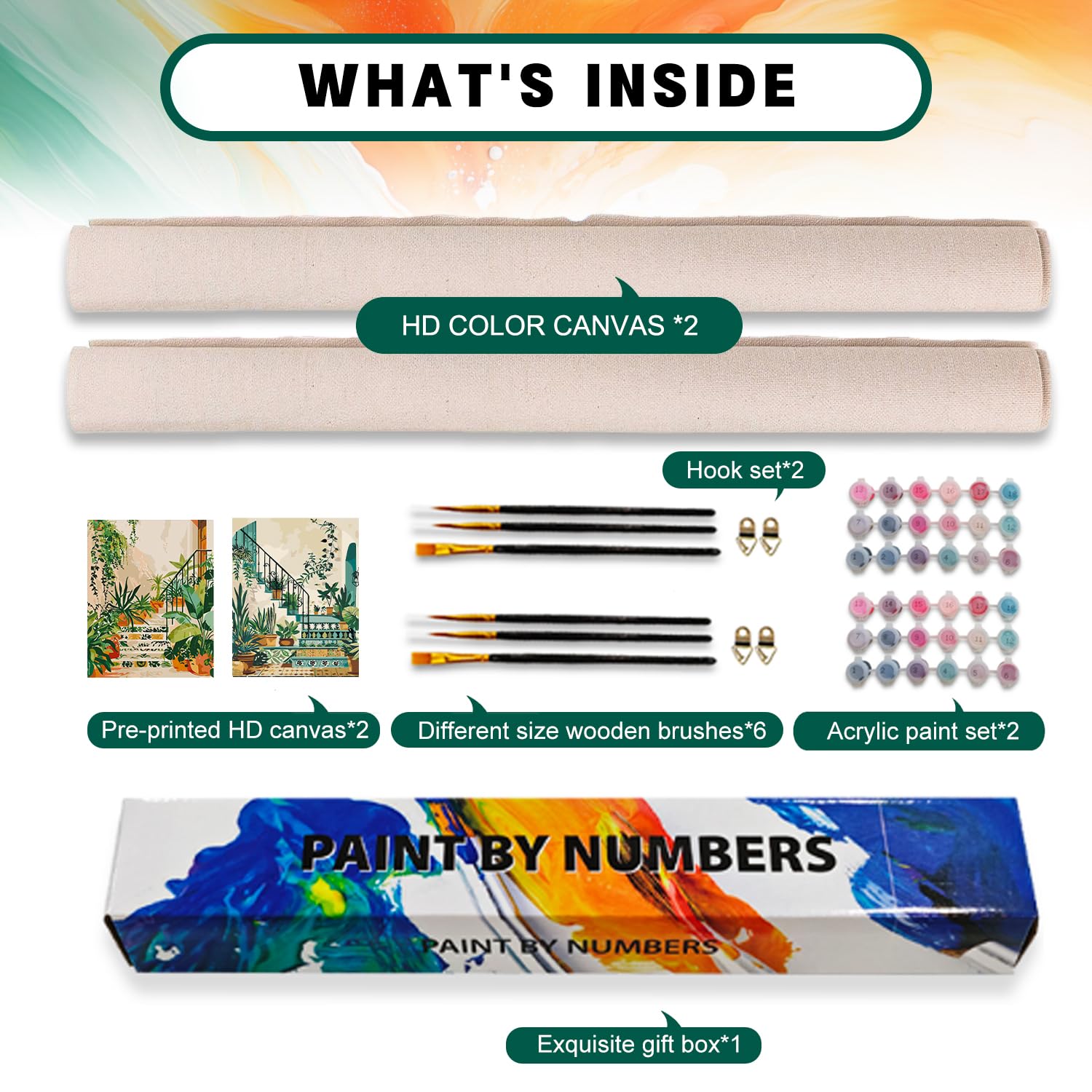 - What Will You Get: You will receive a 2 pack plant paint by numbers kit includes 16x20 Inch HD pre-printed canvas x 2, different size wooden brushes x 6, ample acrylic paint set x 2, hook set x 2, exquisite gift box x 1,we will provide you with everything you need to paint