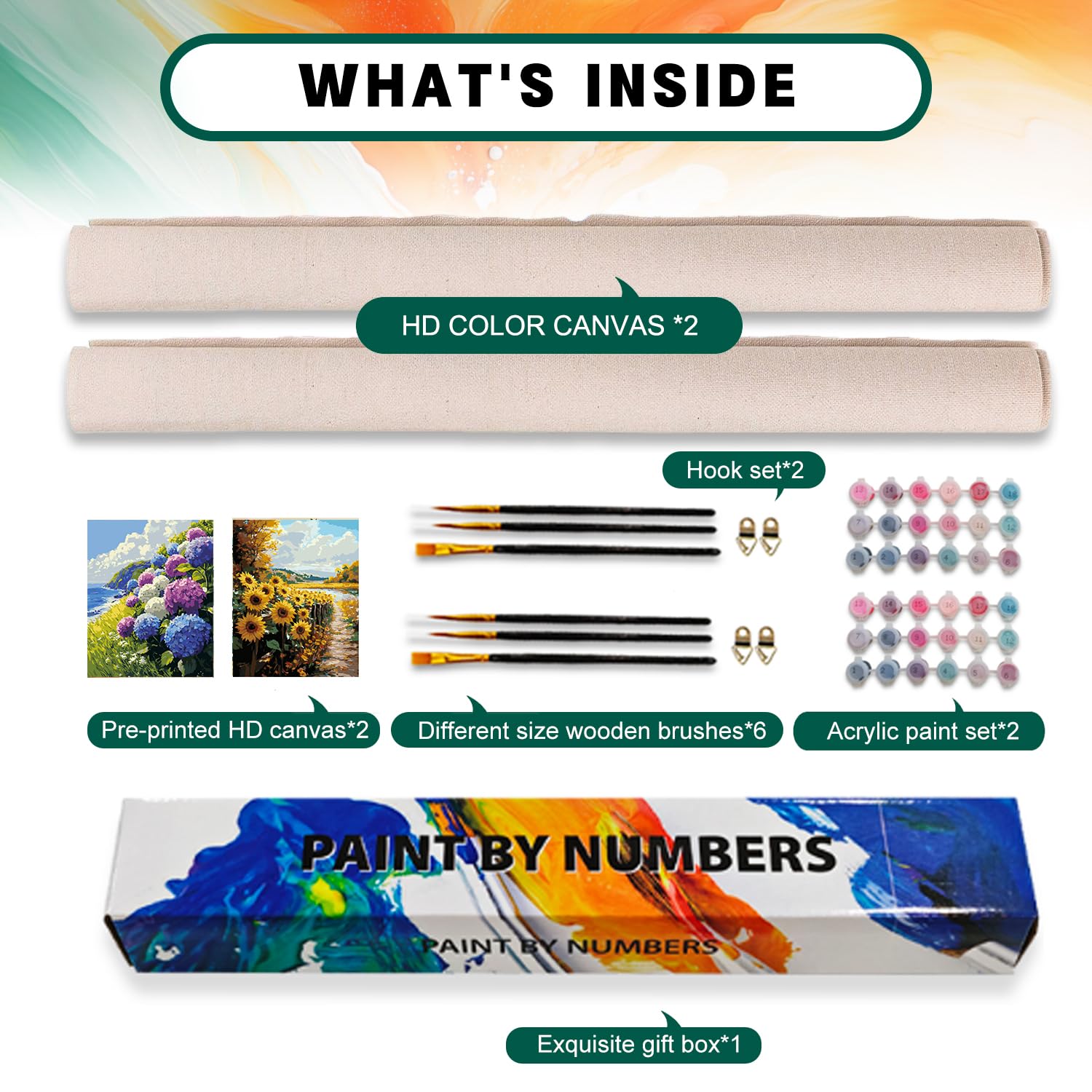 - What Will You Get: You will receive a 2 pack paint by numbers kit includes 16x20 Inch HD pre-printed canvas x 2, different size wooden brushes x 6, ample acrylic paint set x 2, hook set x 2, exquisite gift box x 1,we will provide you with everything you need to paint