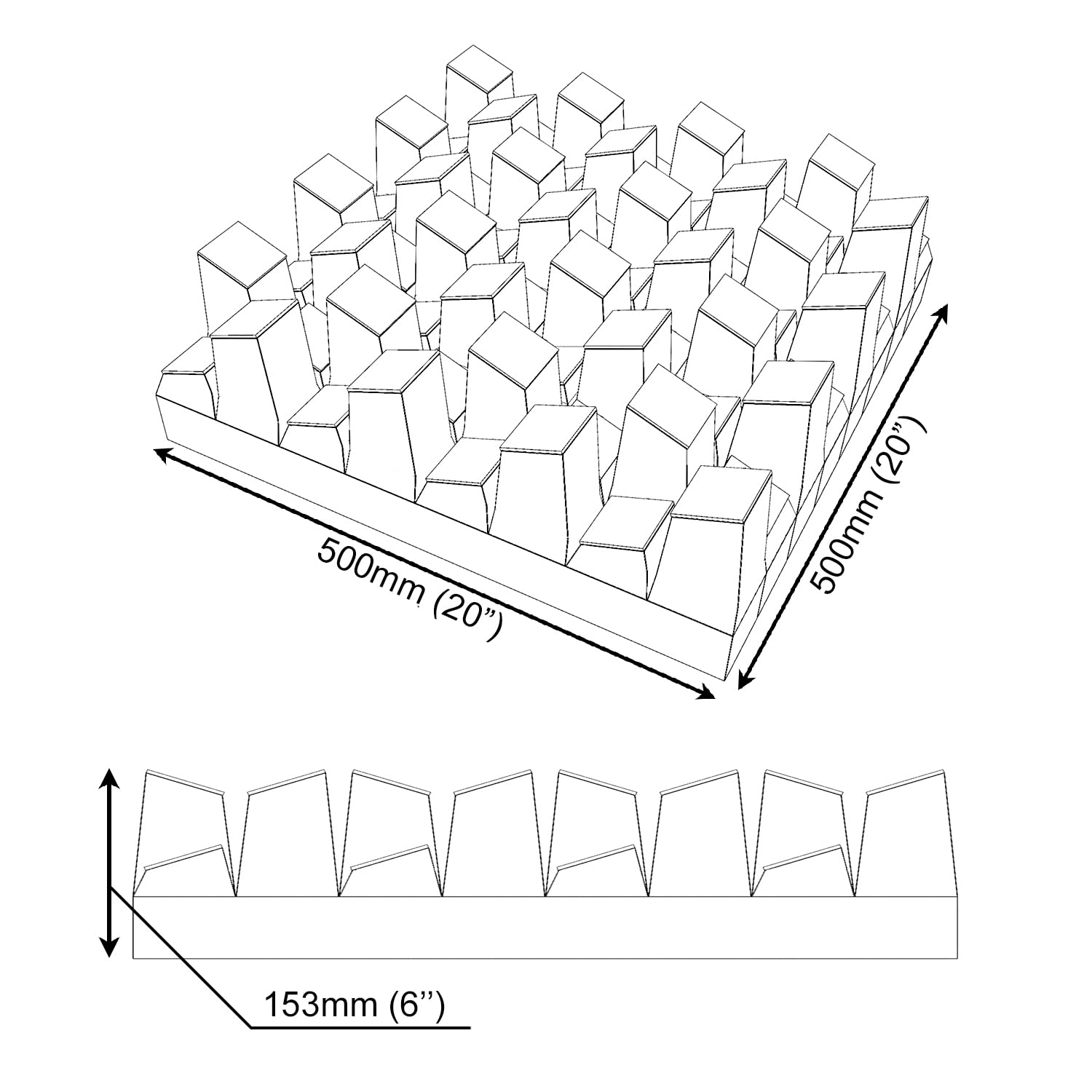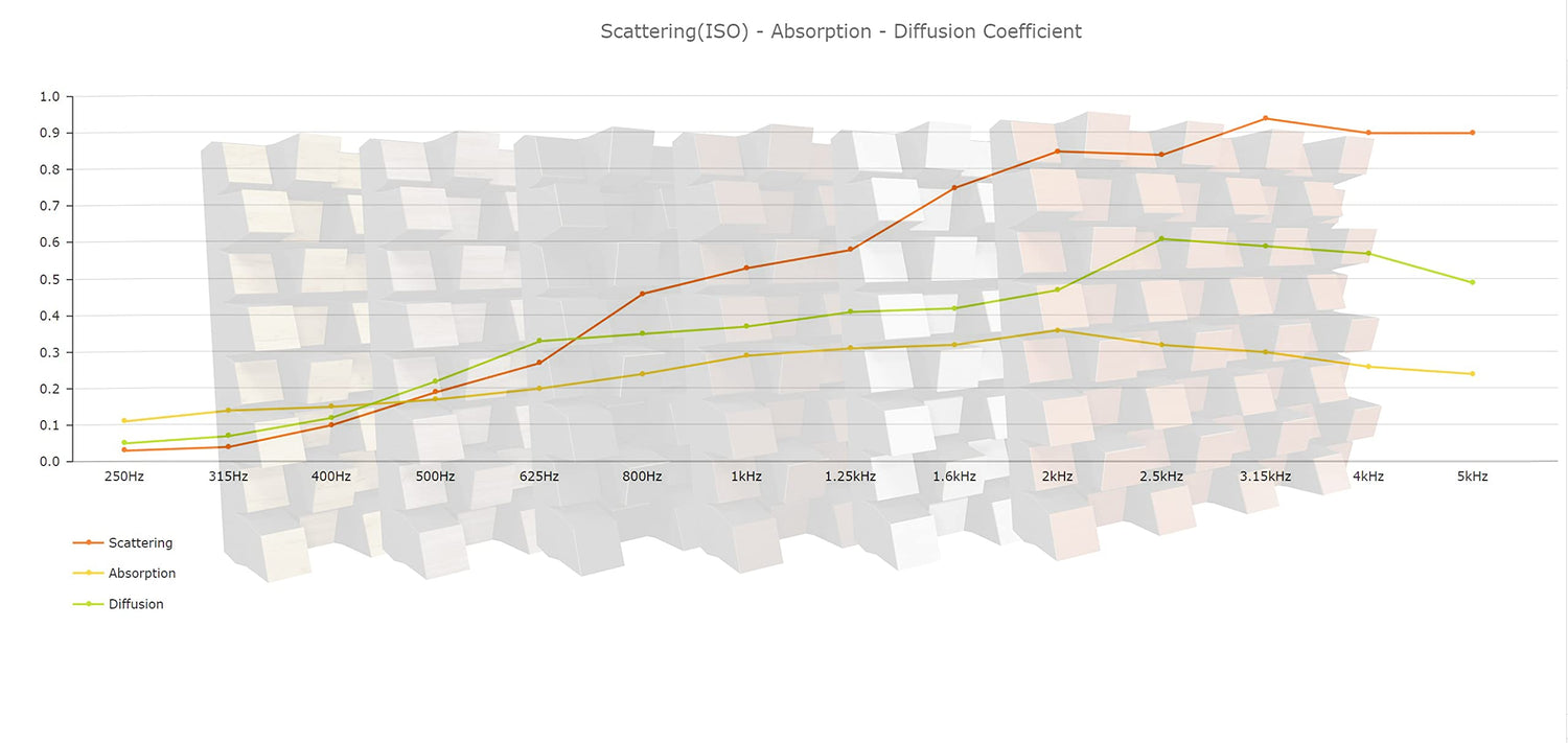 - FUNCTIONALITY: Diffusion, Scattering, Reflection and Absorption | ABSORPTION FREQUENCY: Low, Medium and High Frequencies | SCATTERING RANGE: 625Hz to 5000Hz | Overall NRC: 0.48 | MATERIAL: Laminated MDF and Acoustic Foam | DIMENSIONS: 20x20x6 inches / 500x500x153mm | BOXES OF: 2 units. - area coverage = 5.4ft²/ (0.5m²)