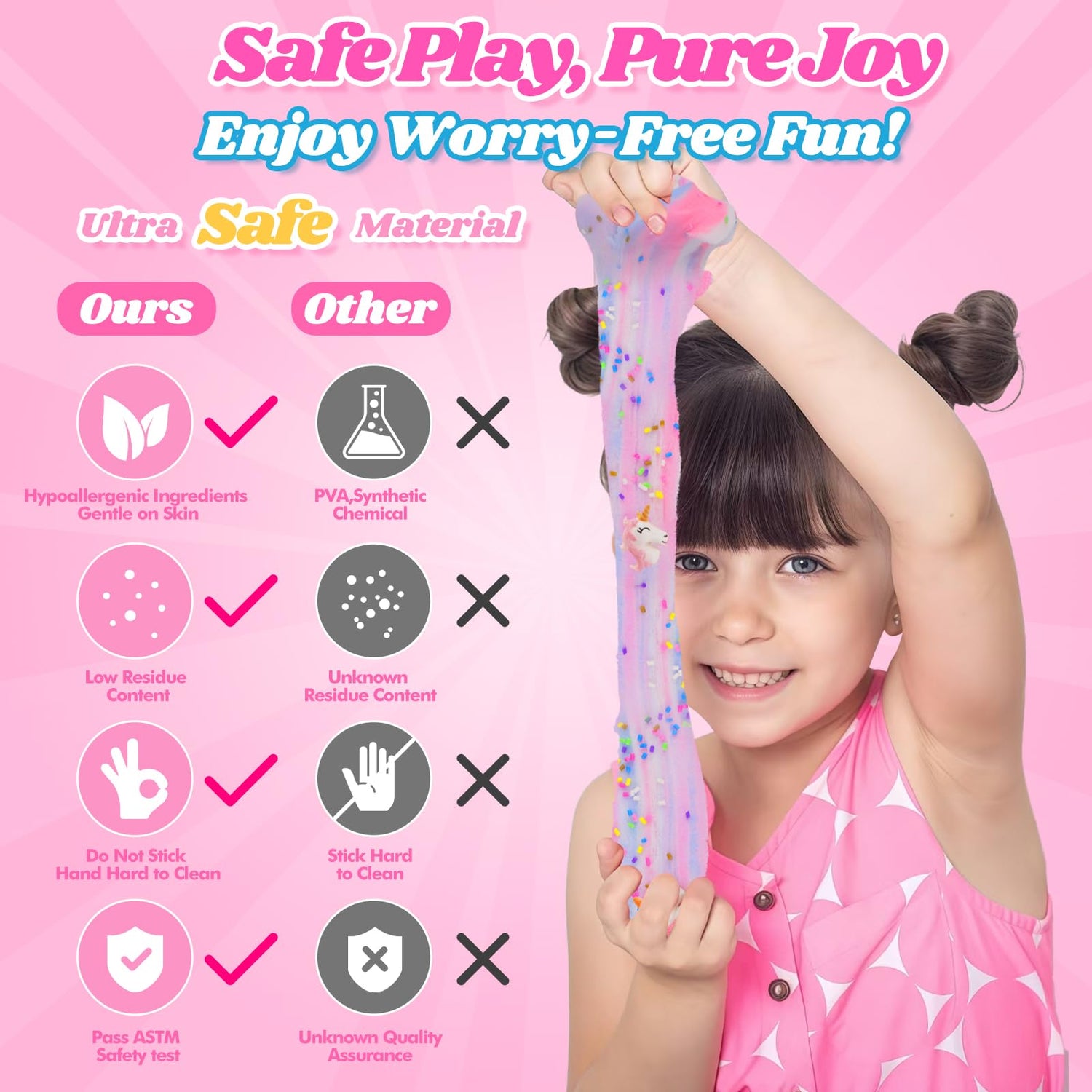 - COOL TEEN GIRLS BIRTHDAY GIFTS PARTY FAVORS: Crafted with high-quality, hypoallergenic, and non-toxic materials, this unicorn-themed cloud slime is gentle on the skin and won't stain. It’s completely safe for both kids and adults, providing a fun, worry-free experience. However, children should always be supervised while playing. Not recommended for children under 3 years old and should not be ingested.