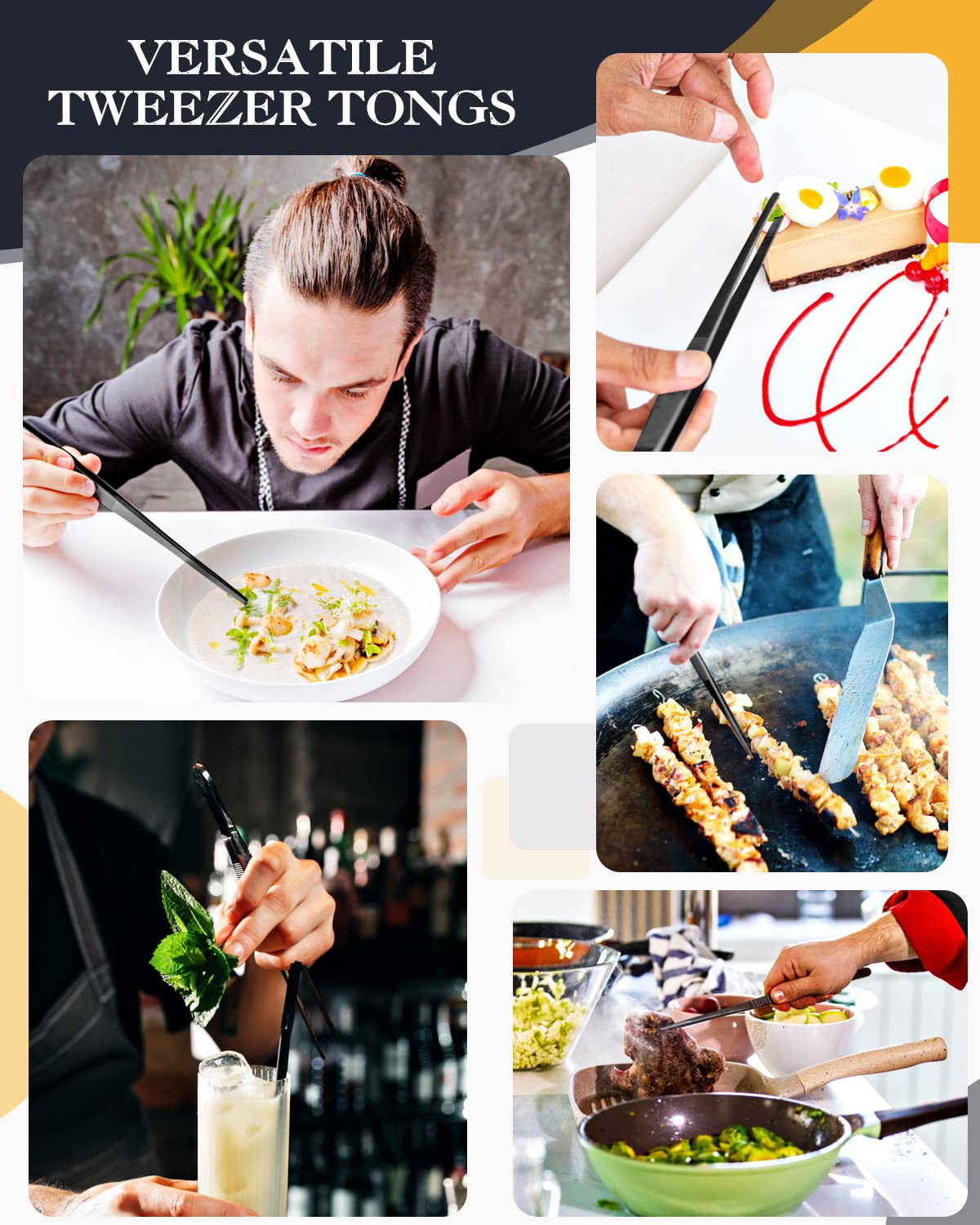 - VERSATILE TWEEZER TONGS: Our tweezers are ideal kitchen tools for precise and detailed cooking tasks, such as handling delicate food, decorating dishes, decorating cakes, cooking flip stir, items, protecting vegetables, gyoza, and egg rolls w/o damaging/ripping them apart, and getting the small food out of the packet or bottle. The Tweezers have a good opening and good resistance, which lends itself to a good enough feel for some delicate tasks